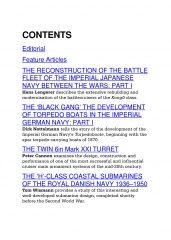 This year's Warship includes features on France's first destroyers, the turn-of-the-century 300-tonne type; Denmark's H-class submarines of World War II; Italy's proposed battlecruiser designs; the Imperial Japanese Navy's Chikuma-class protected cruisers; Soviet S-class submarines; and the first of a series on Imperial Germany's torpedo boats and destroyers.