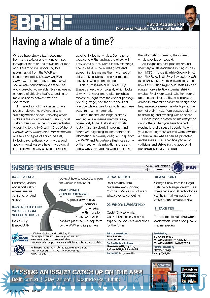 Year: 2025 Language: English Author: Emma Ward (Editor) Genre: Journal, Periodical publication Publisher: The Nautical Institute Edition: Issue no. 39 June, 2025 Format: PDF Quality: eBook Pages count: 12 Description: Inspiring professionalism in marine navigators! The Navigator a publication from The Nautical Institute that champions the role of today's professional marine navigators. Published in association with the Royal Institute of Navigation. In this edition of The Navigator, we focus on detecting, protecting and avoiding whales at sea. Avoiding whale strikes is the collective responsibility of all stakeholders within the shipping industry. According to the IMO and NOAA (National Oceanic and Atmospheric Administration), all sizes and types of ship or vessel, including recreational, commercial and governmental vessels have the potential to collide with nearly all kinds of marine species, including whales. Damage to vessels notwithstanding, the whale will likely come off the worse in the exchange. The increase in the number, size and speed of ships means that the threat of ships striking whale and other marine species is also getting bigger.