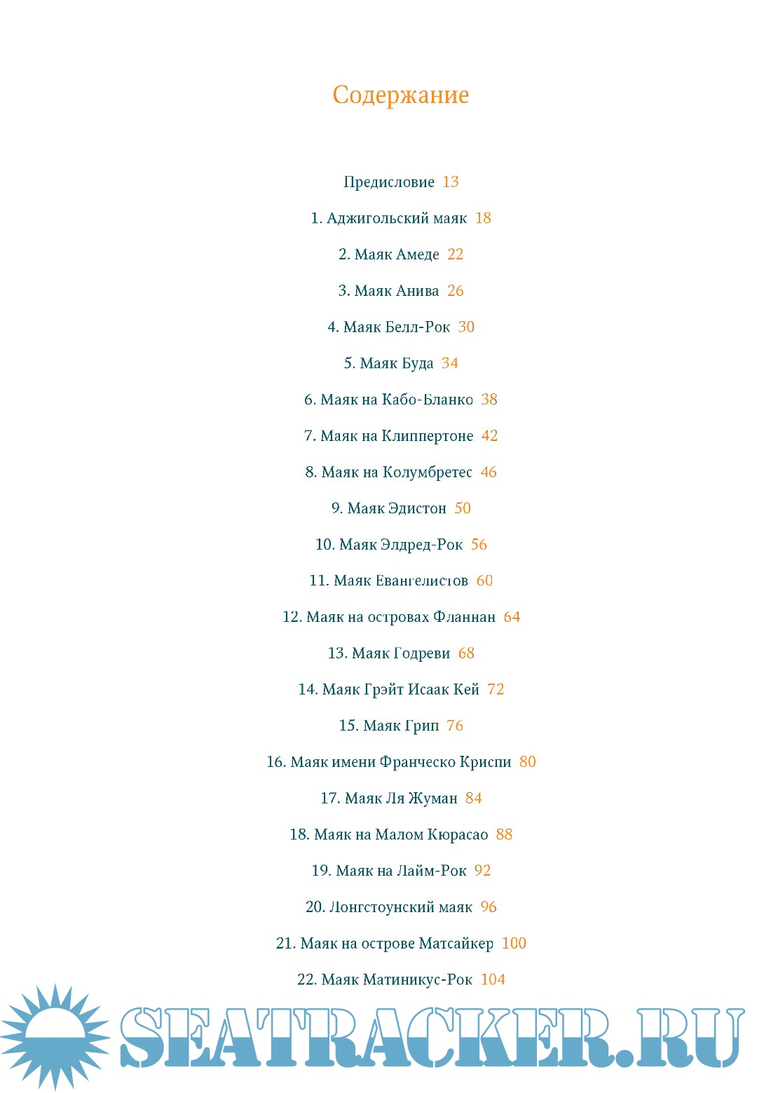 В этом необычном путешествии к самым отдаленным маякам на планете вы познакомитесь не только с особенностями их архитектуры, внутреннего устройства и технического осна­щения, но и со множеством увлекательных историй, связанных со строительством мая­ков и с их смотрителями, с кораблекрушениями и с мистическими происшествиями. Это и рассказ о слепом смотрителе маяка за полярным кругом, о пришедшей на помощь терпя­щим бедствие морякам бесстрашной девушке, о призраке мичмана, являющемся на маяккаждую ночь и выстукивающем на пишущей машинке некое предостережение, о странном человеке, который предпочел укрыться от всех в башне в открытом море... В этих истори­ях сходятся мотивы и творческие горизонты Жюля Верна, Эдгара Аллана По, Вирджинии Вулф, проведшей детство на маяке, Редьярда Киплинга, Рэя Брэдбери и других великихписателей, стремившихся поведать миру об одиночестве, о тревоге, о храбрости и счастье. Текст сопровождают великолепные иллюстрации, морские карты и масштабные планы с указанием точных координат маяков и их технических характеристик — дается схема каждого маяка в разрезе, его точные координаты и параметры светового сигнала, назван инженер, время строительства и введения в эксплуатацию, указано, функционирует ли маяк сейчас или заброшен, какова высота его башни, высота огня над уровнем моря, даль­ность видимости огня, а также приводятся многие другие интересные сведения.