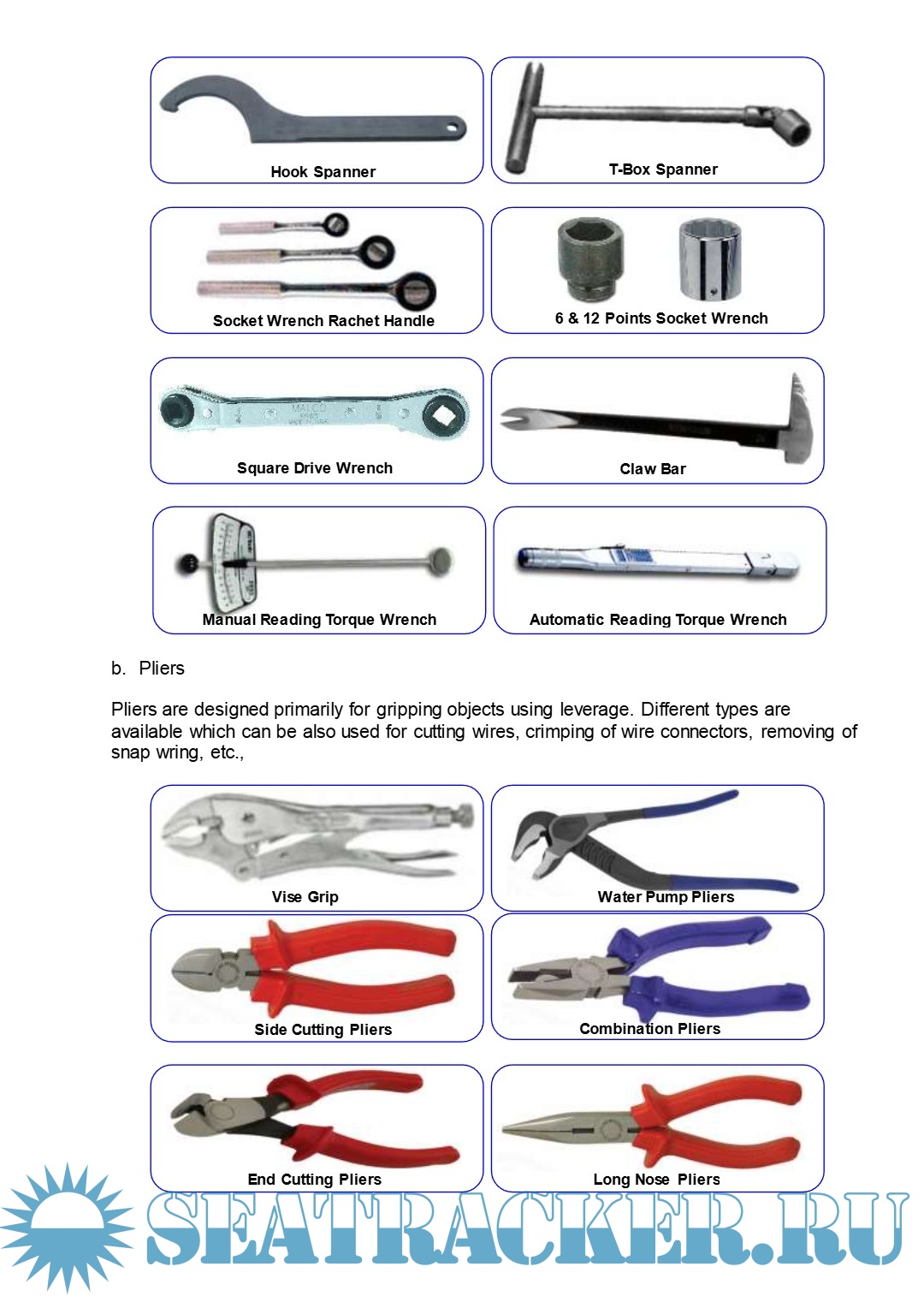 Tools – Thorough review of hand tools essential for maintenance tasks, such as wrenches, pliers, saws, hammers, and pullers. Each tool category is explained with context-specific usage guidance.