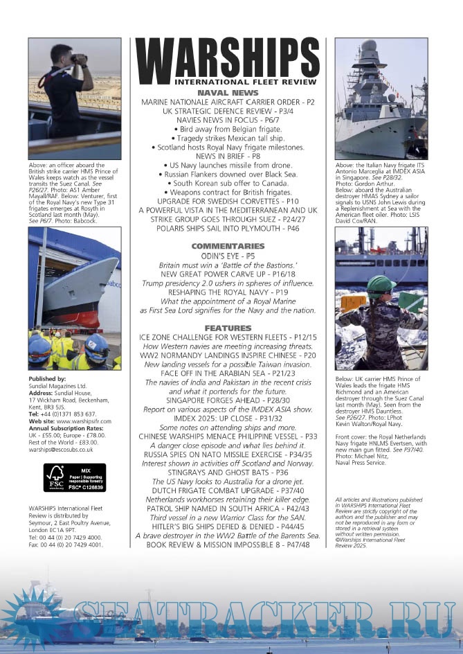 Description: Warships IFR puts the spotlight on the latest developments in the world’s navies. It covers current defence issues and has comments by leading analysts. The magazine regularly includes features on the Royal Navy and the US Navy in addition to incorporating news and features on all other navies across the globe. Warships IFR frequently carries in-depth articles on naval heritage.WARSHIPS International Fleet Review is published 12 times a year by Tandy Media Ltd who also publish Shipping Today & Yesterday (which provides news and features from the world of merchant shipping).