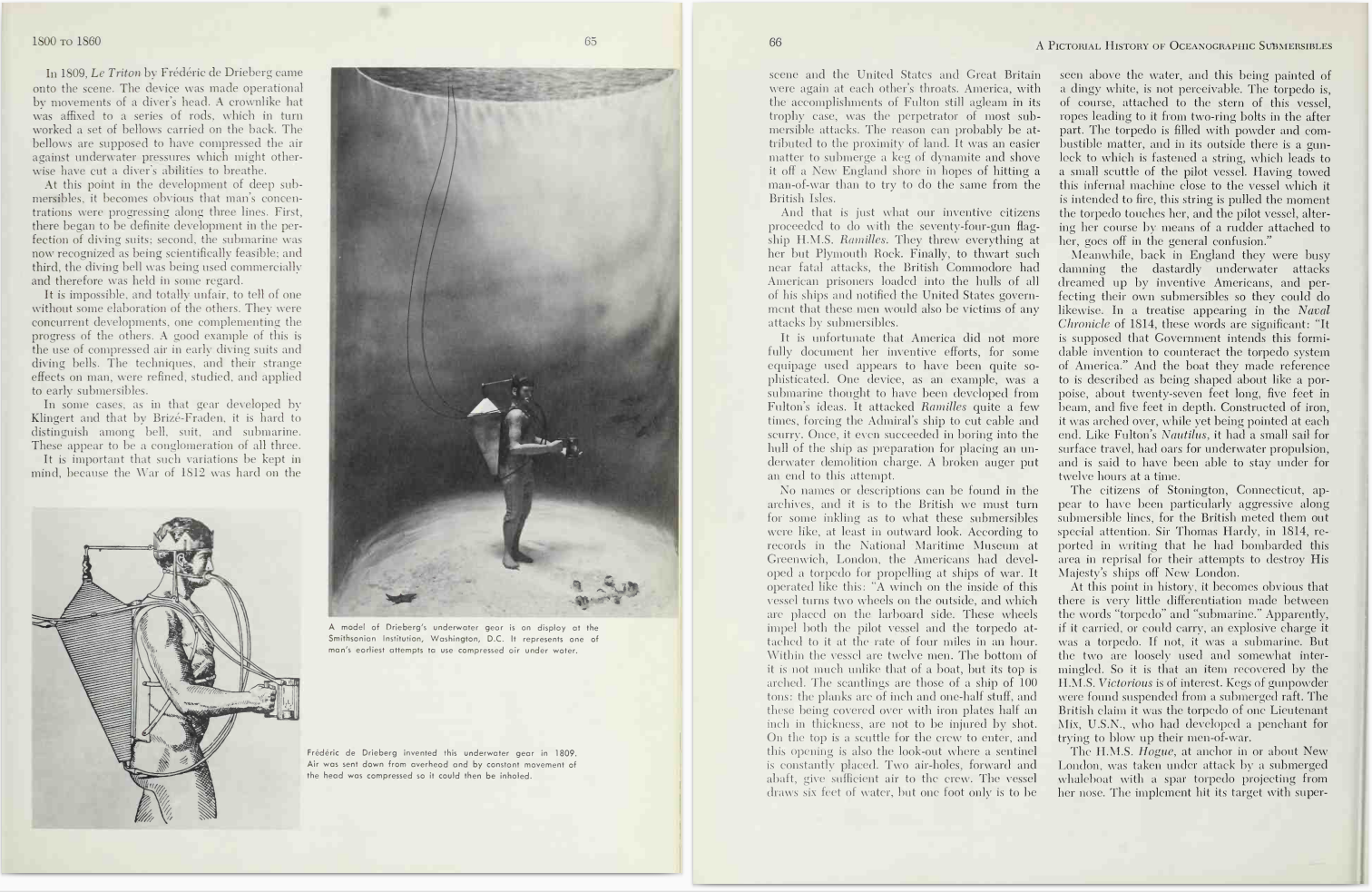 This enthralling development of the whole story of oceanographic submersibles from prehistoric times to today is told in hundreds of pictures and thrilling text. The advances made in each period of their history can be clearly seen. From the weird Greek, Roman, and Persian contraptions designed to let man breathe and move about under water, he rapidly progresses to the more scientific achievements of the seventeenth century: Halley's diving bells and Van Drebbel's so-called submarine; then to the first American submarine Bushnell's Turtle used in the American Revolution.