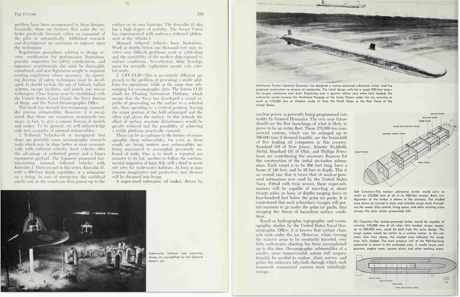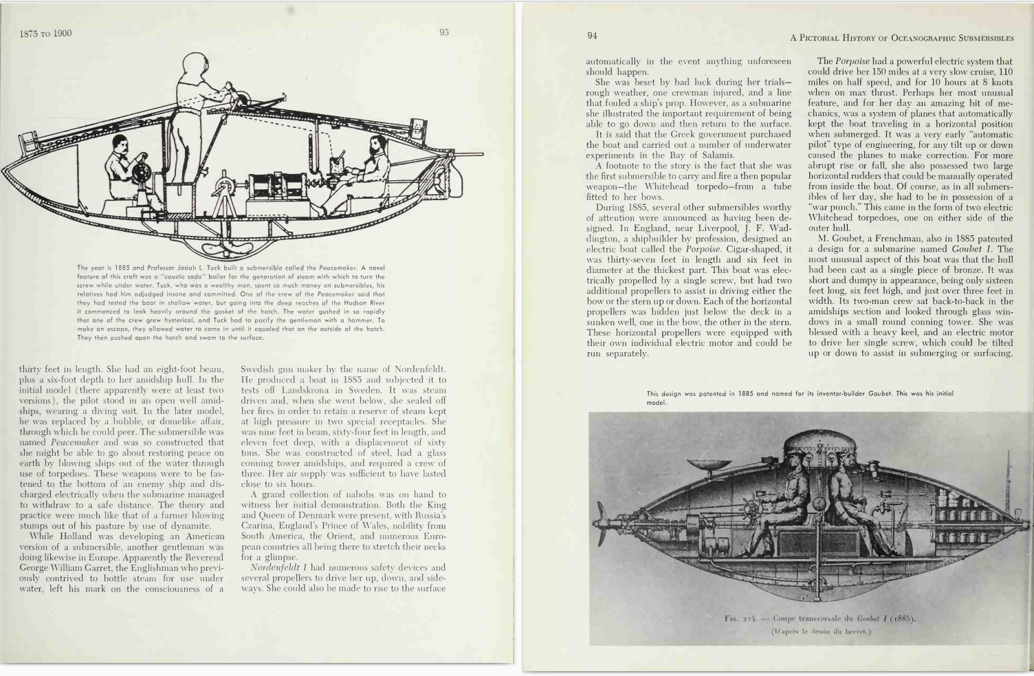 Now follows a parade of submarine innovators and their inventions, including Robert Fulton's Nautilus; Hunley's David, which during the Civil War sank the Union ship Housatonic; John Holland's many models of his Holland class; American, English, German, Russian, and Japanese submarines of World Wars I and II ending with the American atomic classes of submarines from the first one, the U.S.S. Nautilus, to the polaris-missile-equipped U.S.S. George Washington.