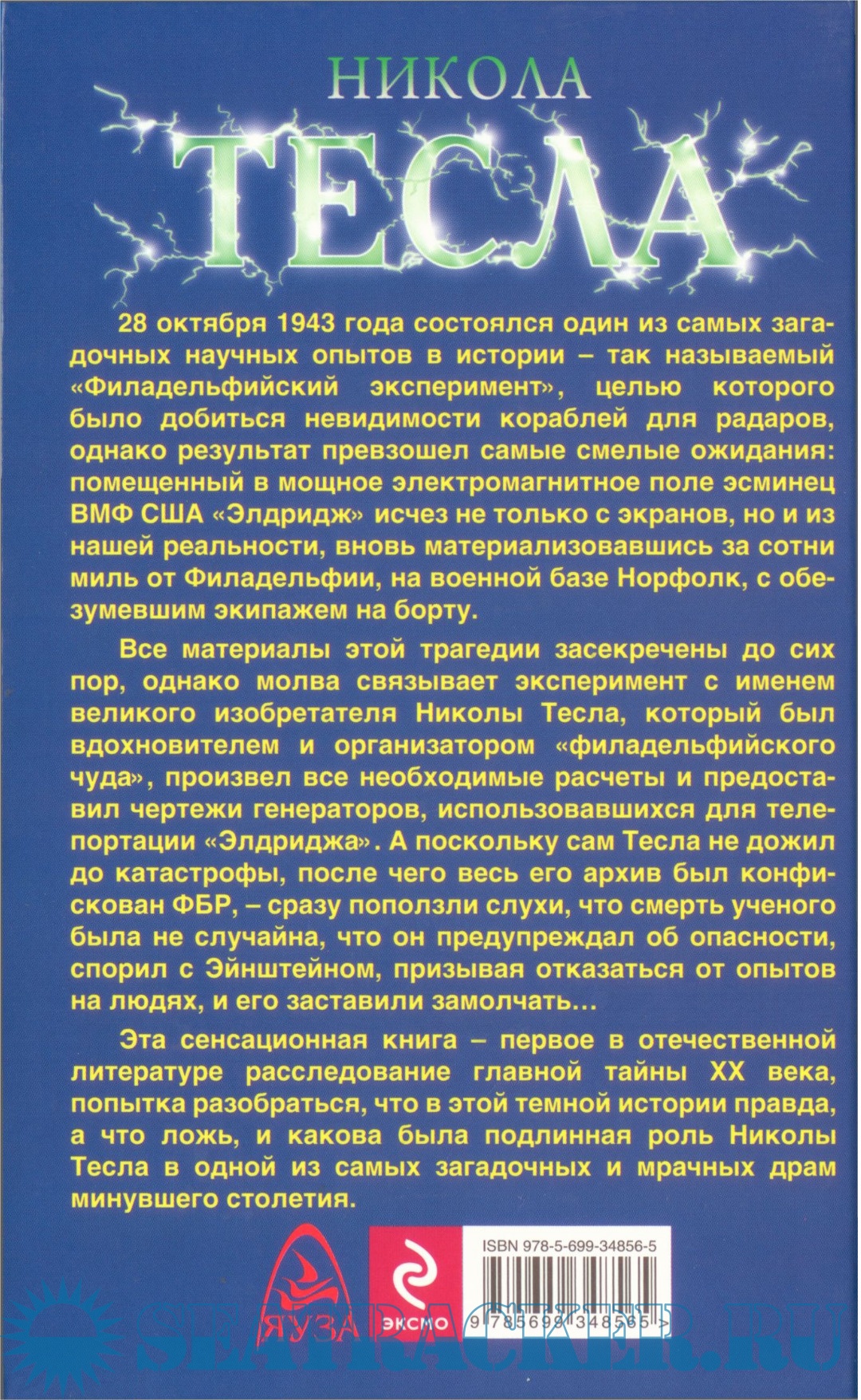 Описание: Сенсационное расследование главной тайны XX века! Новые данные о загадочном Филадельфийском эксперименте, в результате которого был телепортирован на сотни миль эсминец ВМФ США "Элдридж", а его экипаж погиб или сошел с ума. Все материалы этой трагедии засекречены до сих пор, однако молва связывает ее с именем Николы Тесла, который был вдохновителем и организатором "филадельфийского чуда", но сам до эксперимента не дожил - ходят слухи, что смерть великого ученого была не случайна, что он предупреждал об опасности, спорил с Эйнштейном, призывая отказаться от опытов на людях, и его заставили замолчать... Проанализировав всю доступную информацию, рассмотрев все версии событий, эта сенсационная книга раскрывает подлинную роль Николы Тесла в Филадельфийском эксперименте и ставит точку в споре о причинах трагедии и обстоятельствах смерти великого ученого.