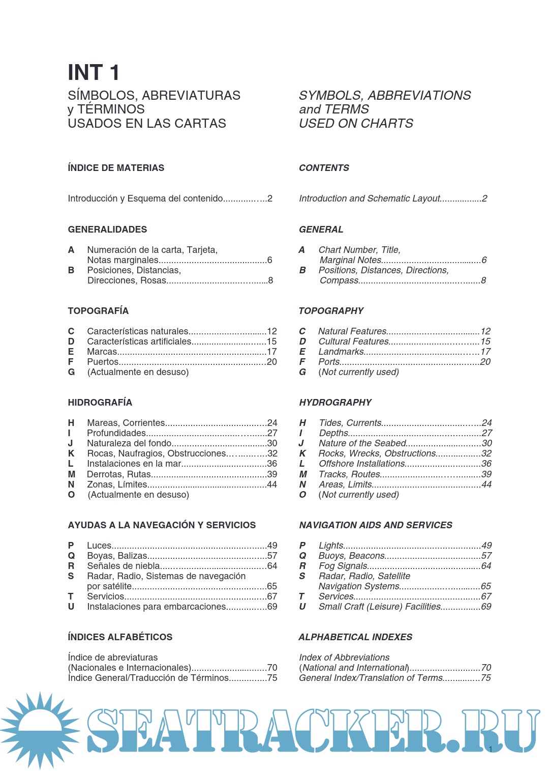 Description: This edition of Symbols, Abbreviations and Terms used on charts is based upon the “Chart specifications of the IHO” (IHO: International Hydrographic Organization), which came into force at the XIIth International Hydrographic Conference 1982 in Monaco. This publication also shows number INT 1, as being the official publication of the IHO in Spanish language on this topic.
