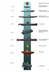 Mais l’histoire des sous-marins n’est pas seulement militaire, elle est aussi scientifique avec l’exploration des fonds sous-marins. Si les terres émergées ne réservent plus beaucoup de surprises, les profondeurs sous-marines restent pour partie Terra incognita ou plutôt Mare incognita. À bord de son bathyscaphe Le Trieste, Auguste Piccard réussit à descendre en 1960 dans la fosse des Mariannes, la plus profonde au monde (plus de 10 900 m).