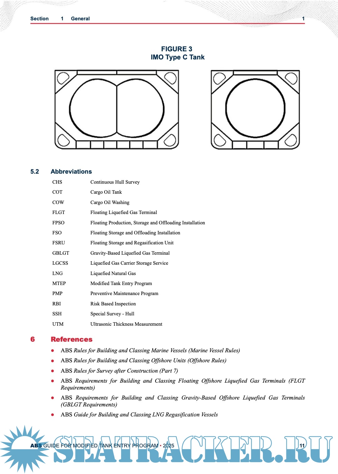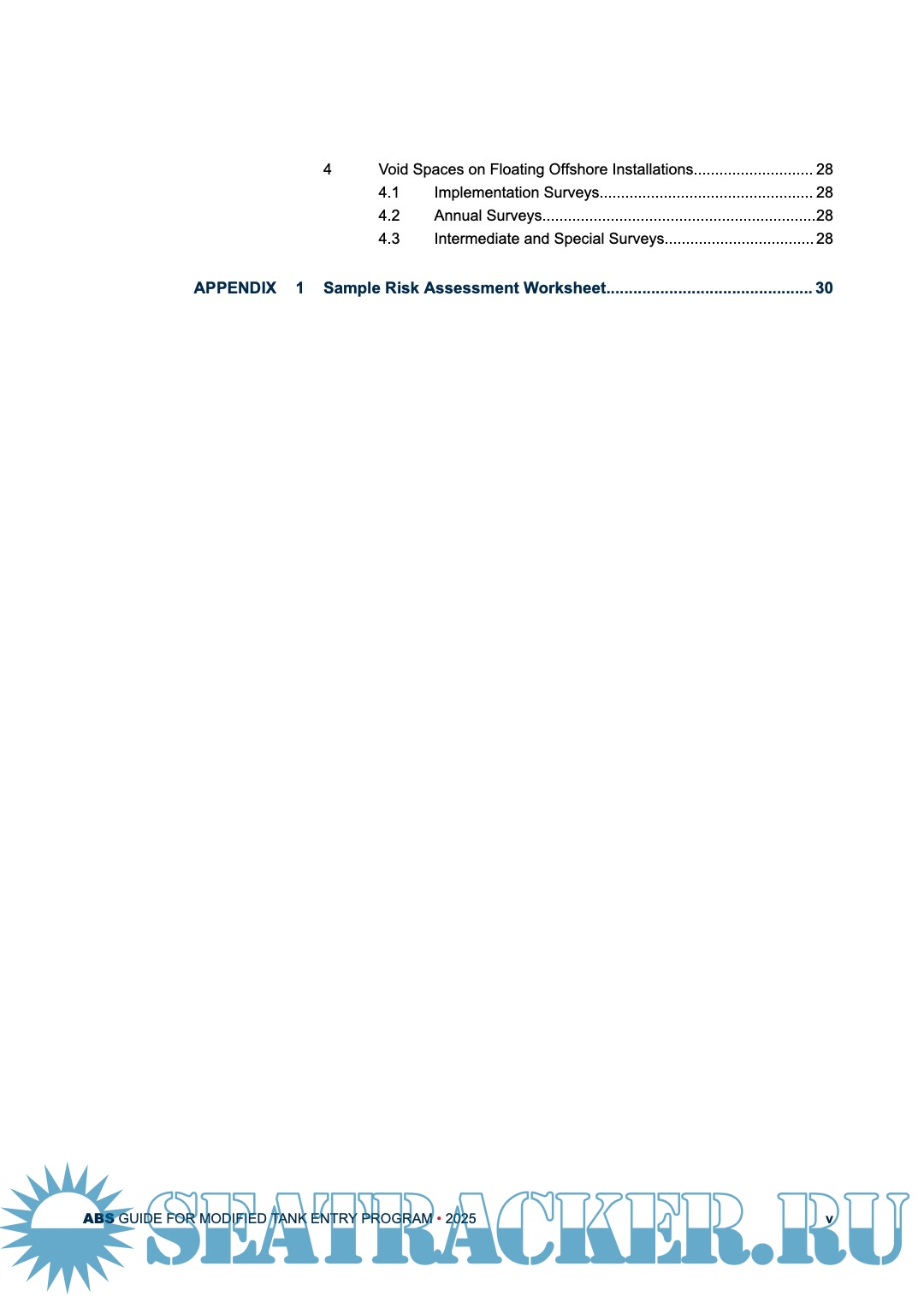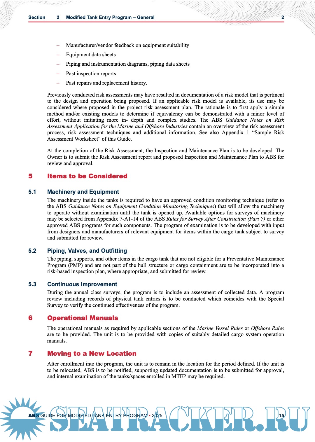 Year: 2025 Language: English Author: ABS Genre: Methodological guide Publisher: ABS Format: PDF Quality: eBook Pages count: 32 Description: The intent of this Guide for Modified Tank Entry Program is to provide requirements for prolonging the tank entry beyond the conventional five-year intervals for site-specific units such as Floating Storage and Regasification Units (FSRUs) when engaged in long-term employment on a single site, Floating Production and Storage and Offloading Installations (FPSOs), Floating Storage and Offloading Installations (FSOs), and Floating Offshore Liquefied Gas Terminals (FLGTs). Where a unit is proposed to undertake long term employment at a single site, a tank entry program utilizing alternative means to credit surveys with examination dates in excess of five years may be considered to satisfy the periodical tank entry surveys required in the ABS Rules for Survey After Construction (Part 7). This Guide is for the use of designers, builders, owners and operators and specifies the ABS requirements for obtaining the optional notation MTEP. This Guide becomes effective on the first day of the month of publication.
