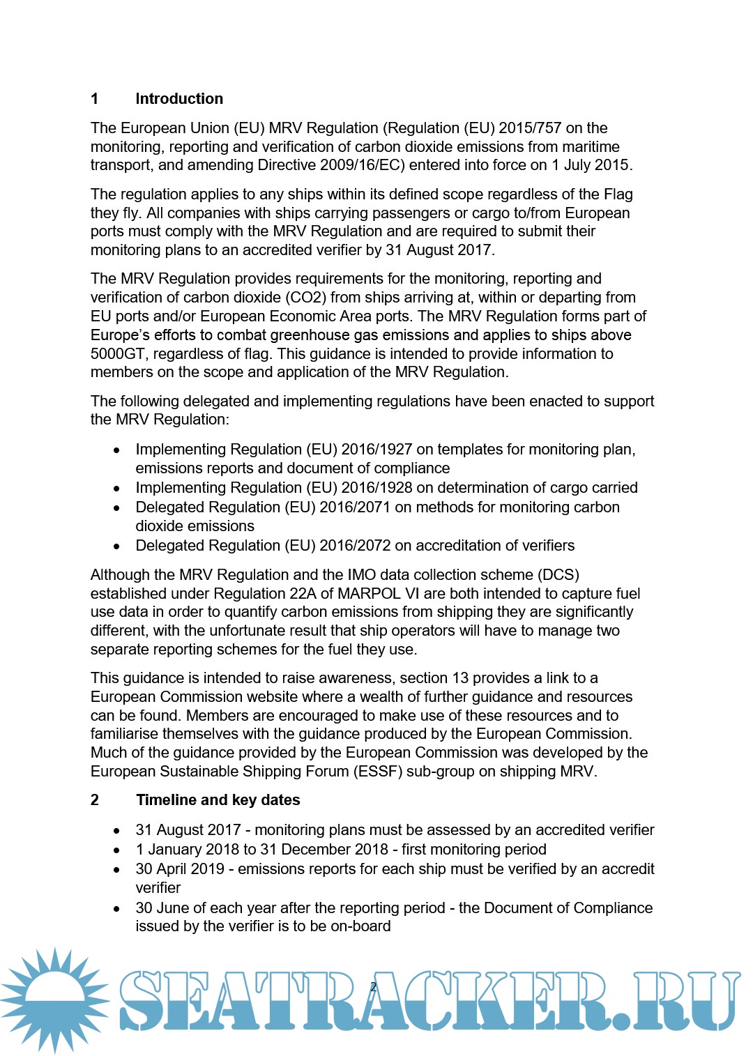 1 Introduction ........................................... 2 2 Timeline and key dates ................................. 2 3 Scope .................................................. 3 4 Monitoring and reporting ............................... 4 5 Distance travelled, cargo and transport work ........... 6 6 Monitoring plan ........................................ 7 7 Emissions report ....................................... 9 8 Verification and verifiers.............................. 9 9 Document of compliance ................................. 10 10 Penalties ............................................. 11 11 Publication of data ................................... 11 12 MRV Regulation and IMO Data Collection Scheme (DCS) ... 12 13 Further reading and resources ......................... 12