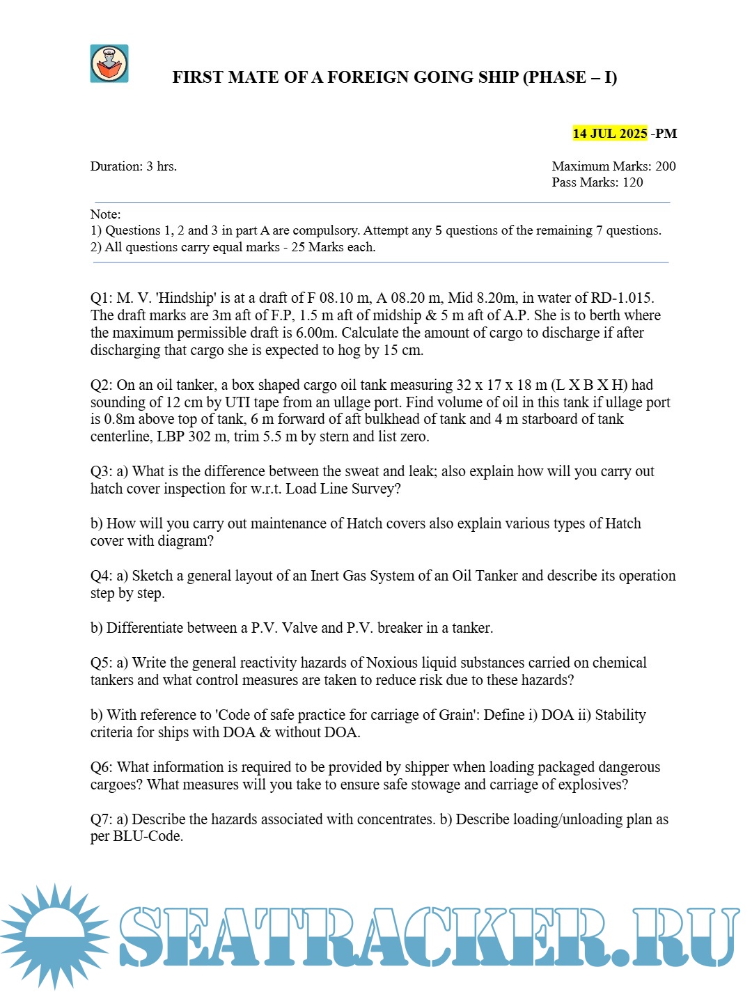 Question Paper Set Cargo Work (July 2025) Phase I (Chief Mate F.G.) Mercantile Marine Department (MMD), India Examinations
