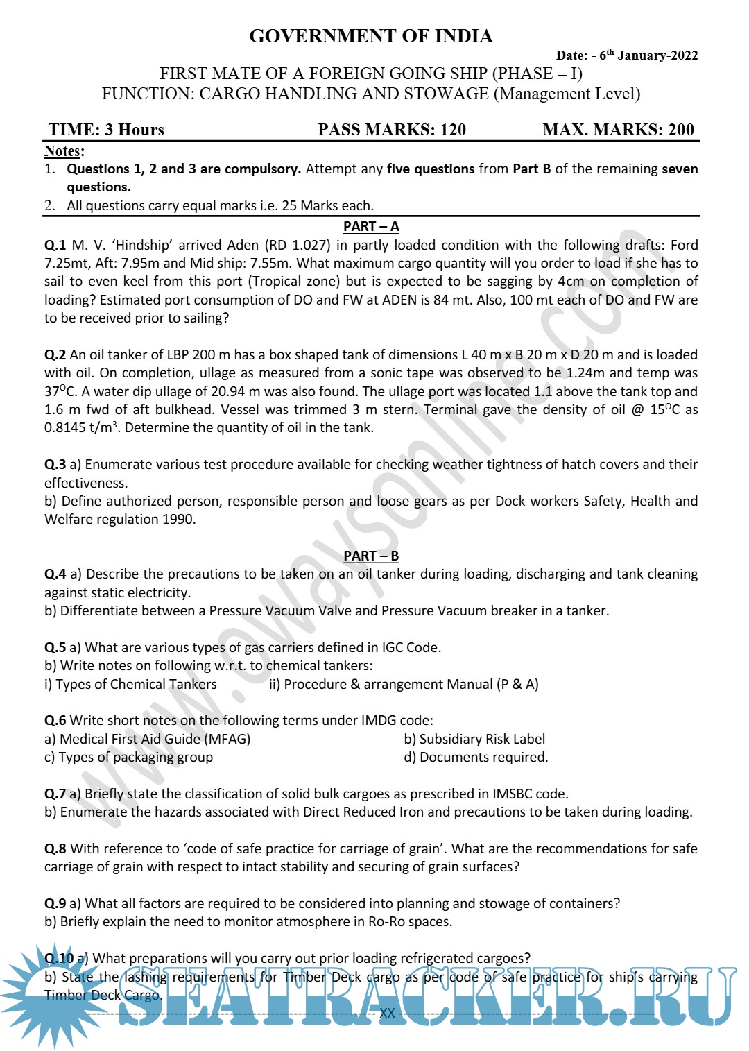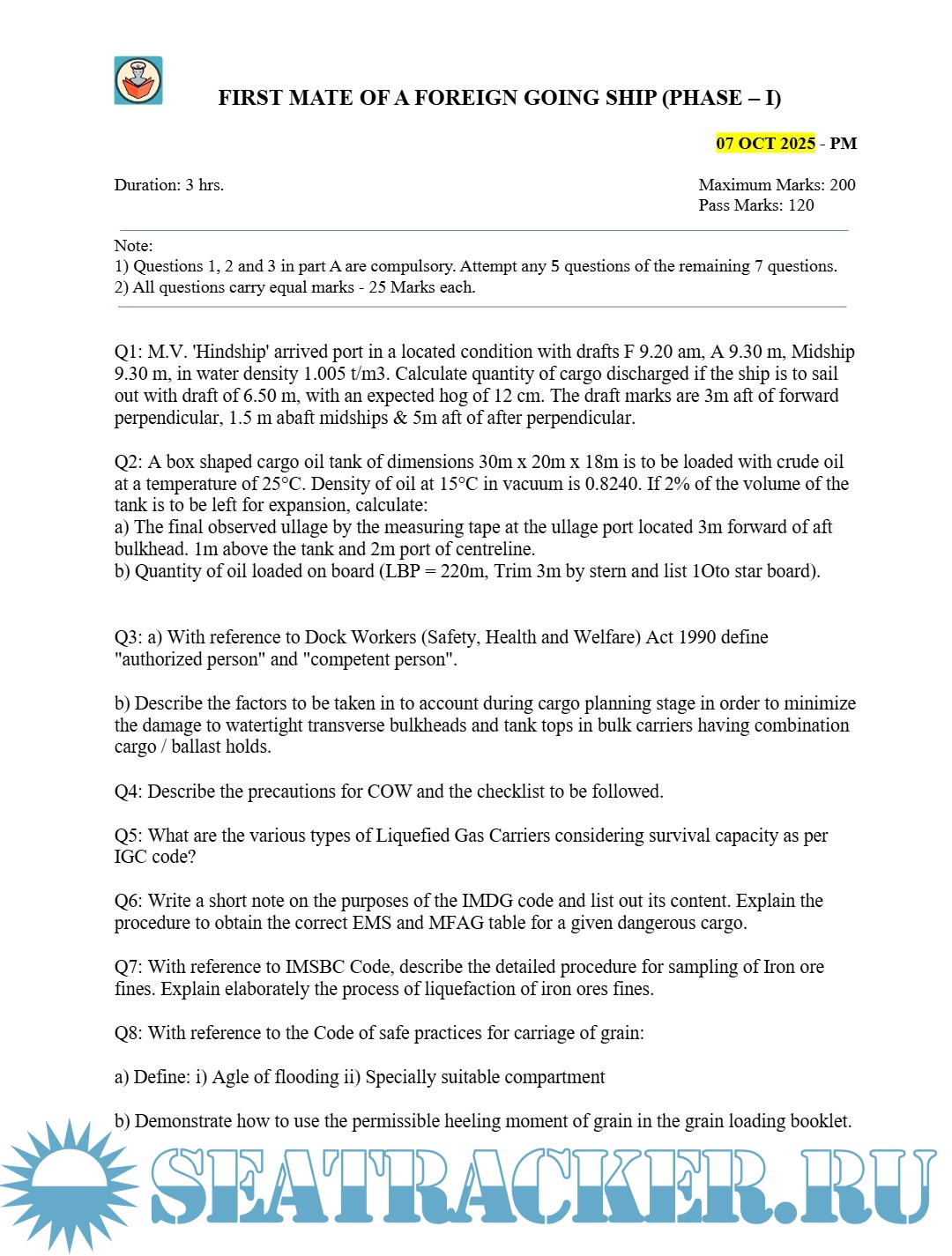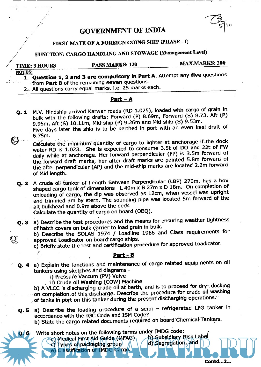 Description: Question paper set for Cargo Work Mercantile Marine Department (MMD), India Exams for Phase I - Chief Mate (F.G.).