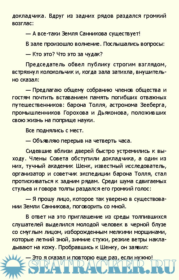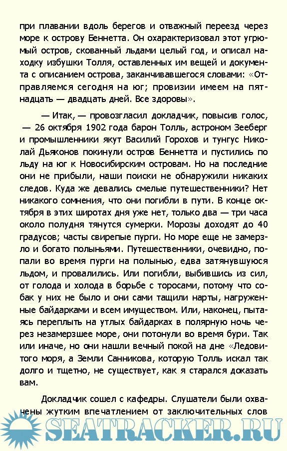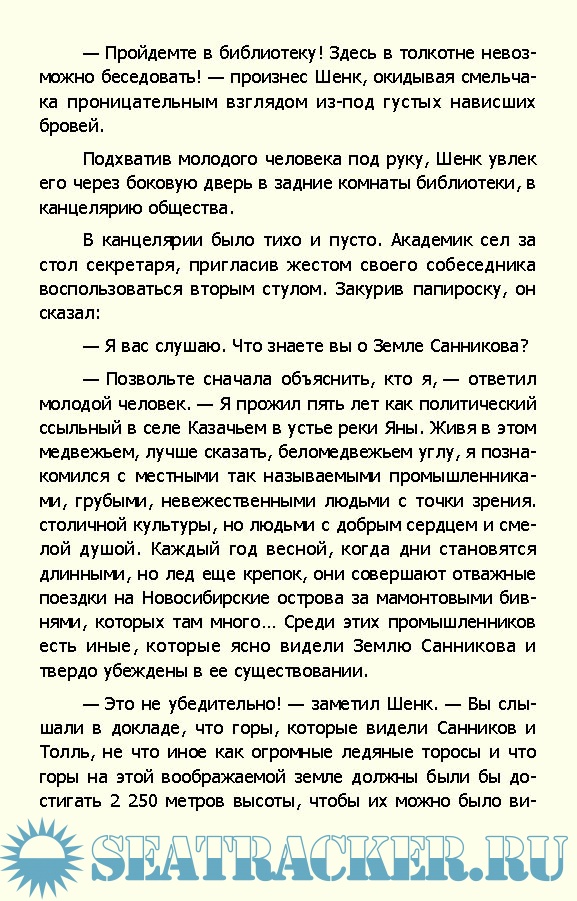 Описание: "Земля Санникова" - научно-фантастический роман, написанный русским геологом, палеонтологом, географом и писателем В.А.Обручевым. В основу книги положена легенда северных народов о существовании таинственной теплой земли в Северном Ледовитом океане. Благодатный остров - оазис среди льдов - покрыт лесами и лугами в кольце огромных гор, здесь живут ископаемые существа: мамонты, саблезубые тигры, пещерные медведи и шерстистые носороги, обитают первобытные племена. Несмотря на то, что Земли Санникова на самом деле нет на свете, возможность существования теплого острова в краю вечной мерзлоты Обручев обосновывает с научной точки зрения. Захватывающие приключения сочетаются с детальным описанием окружающей природы, строения почвы и животного мира, быта и обычаев туземных народов.