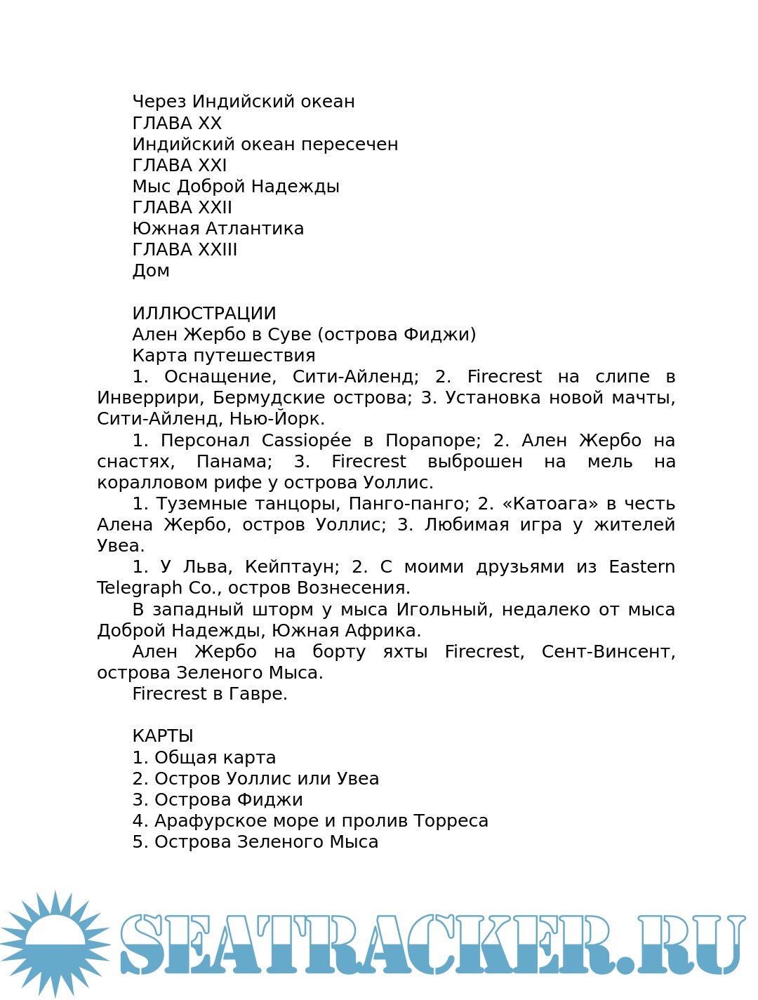 Описание: Ален Жербо (1893-1941) французский моряк, писатель и чемпион по теннису, совершивший кругосветное плавание в одиночку. В конце концов он осел на островах южной части Тихого океана, где написал несколько книг об образе жизни островитян. В книге «In quest of the sun» (В поисках солнца) описывается дальнейшее кругосветное одиночное плавание автора на яхте «Файркрест» из Нью-Йорка через Панамский канал, Тихий океан и Полинезию, Арафурское море, Индийский океан, мыс Доброй Надежды и Атлантику в Гавр (Франция) в 1924 - 1929 годах. Всего в этом плавании было проведено 700 дней в море и пройдено более 40000 миль.