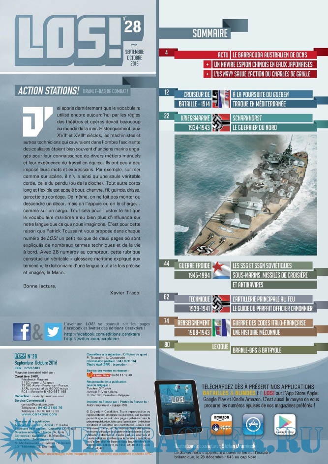 Description: LES ÉDITIONS CARAKTÈRE PRENNENT LE LARGE EN LANÇANT UN NOUVEAU MAGAZINE CONSACRÉ À LA GUERRE NAVALE !Les sujets passionnants ne manquent pas et LOS ! met un point d’honneur à les présenter au lecteur comme cela n’a jamais été fait dans la presse française jusqu’à présent. Un seul mot d’ordre pour l’équipe rédactionnelle : rigueur scientifique et présentation ludique !S’appuyant sur un fond photographique d’exception, sur des plans de bateaux et d’avions, les éditions Caraktère innovent une fois de plus en vous proposant aussi des vues 3D détaillées, le tout au service de textes soigneusement rédigés par des auteurs spécialisés. Vous comprendrez ainsi comment fonctionne un submersible, comment se déroule un combat naval, comment est conçu un cuirassé ou comment attaquent les avions-torpilleurs !Revivez au fil des pages l’aventure humaine exceptionnelle des matelots de la marine marchande affrontant les U-Boote en Arctique, ou celle des pilotes embarqués sur les porte-avions américains et japonais. Lisez les exploits des hommes-grenouilles italiens en Méditerranée, des équipages des vedettes lance-torpilles dans la Manche, des sous-marins soviétiques de la guerre froide ou des grands cuirassés de 1914-18