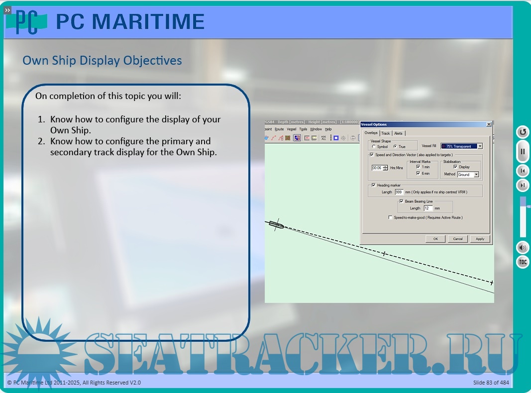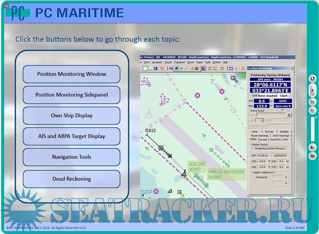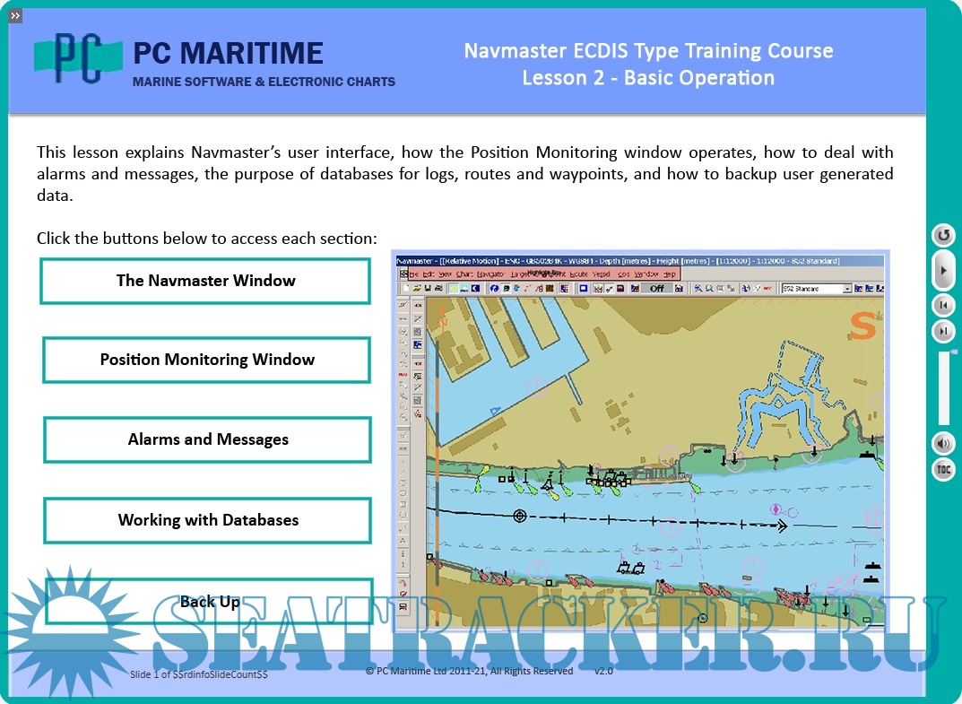 - 7 lessons with voice-over, text explanations, and video demonstrations of Navmaster ECDIS workflows.