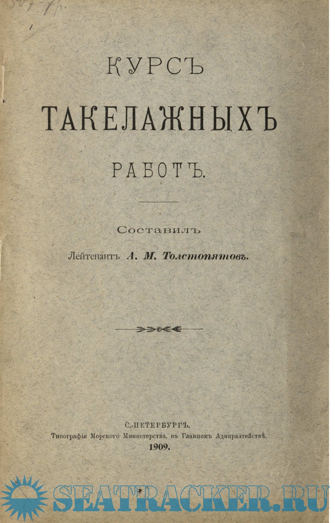 Описание: Курс «Курс такелажных работ» был принят как руководство в Морском корпусе и мореходных училищах и охватывает все вопросы, касающиеся такелажных работ. В предисловии к «Курсу…», вышедшему в 1909 году в типографии Морского министерства в Главном адмиралтействе, Санкт-Петербург, его составитель, лейтенант А. М. Толстопятов писал: «Издавая настоящий курс такелажных работ, я задался целью выпустить руководство, дающее возможность изучить вполне самостоятельно, без посторонней помощи, эту отрасль морской практики, которая и по сие время сохранила вполне свое прежнее значение».
