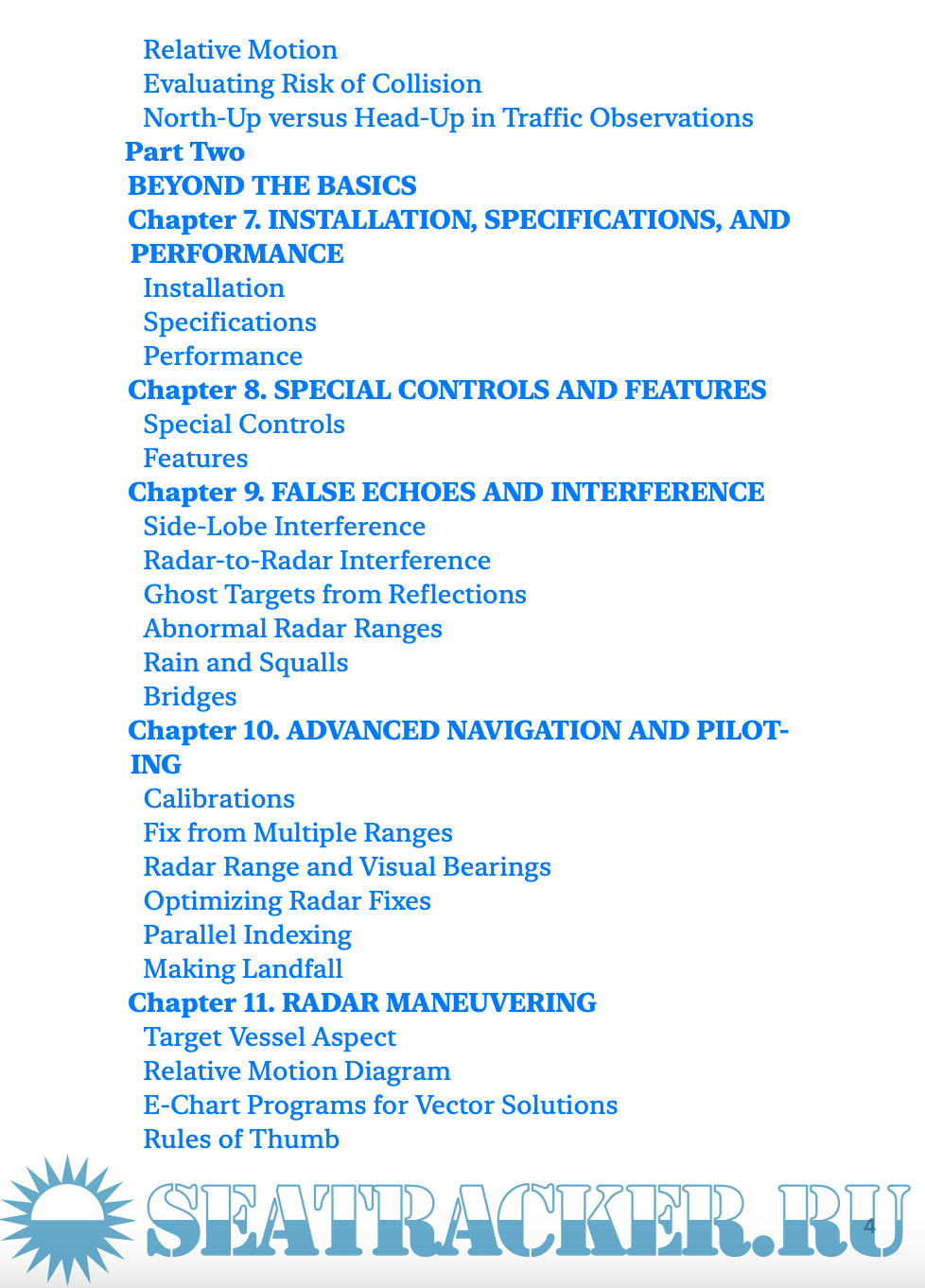 We hope that this book reflects our years of radar teaching experience both in the classroom and even more pertinent in our onboard courses underway. The book is divided into two parts, Basics and Beyond the Basics (see Preface notes in the Features link), so that readers can get underway with safe, efficient radar usage as soon as possible.