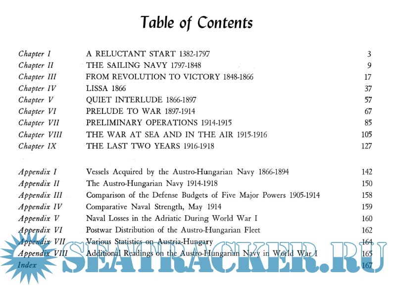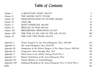 Description: This is the most comprehensive book on the old Austo-Hungarian Navy and fleet I have ever found. It traces the fleet from the 18th century through 1918. Naturally, it covers the battle of Lissa in 1866. This is followed by descriptions of the evolution of the ship designs of the late 19th and early 20th centuries. The text is accompanied by a very good collection of period black and white photos. There are also several good maps of the Adriatic, Cattaro, and the Otranto area in WW I. Pages 133 - 135 contain a short description of the sinking of the battleship "Szent Istvan." A couple of Appendices provide brief tabulations of dimensions, armament, armor thicknesses, and performance characteristics of the ships. Appendix III contains an interesting comparison of the naval budgets of the various international naval powers of 1905, 1910, and 1914.