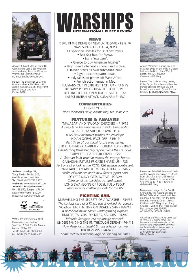 Description: Warships IFR puts the spotlight on the latest developments in the world’s navies. It covers current defence issues and has comments by leading analysts. The magazine regularly includes features on the Royal Navy and the US Navy in addition to incorporating news and features on all other navies across the globe. Warships IFR frequently carries in-depth articles on naval heritage.WARSHIPS International Fleet Review is published 12 times a year by Tandy Media Ltd who also publish Shipping Today & Yesterday (which provides news and features from the world of merchant shipping).