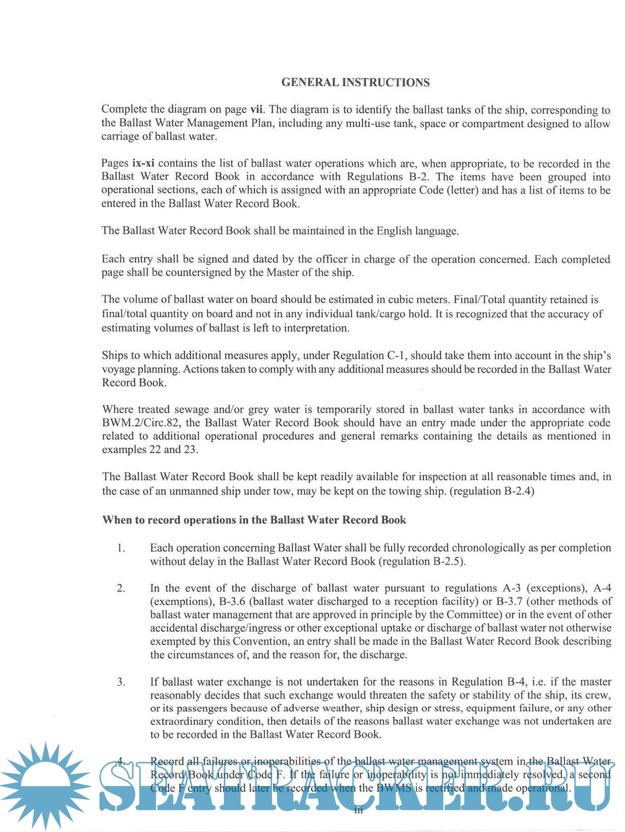 Together with the enclosed instructions, this is the Official Ballast Water Record Book of the Maritime Administrator. This Book has been designed so that it may be used by ALL ships for recording ballast water operations. In accordance with regulation 8-2 of the annex to the International Convention for the Control and Management of Ship's Ballast Water and Sediments, a record is to be kept of each ballast water operation. Each ship shall have on board a Ballast Water Record Book, that may be an electronic record book, or that may be integrated into another record book or system, and which shall at least contain the information specified in appendix II.