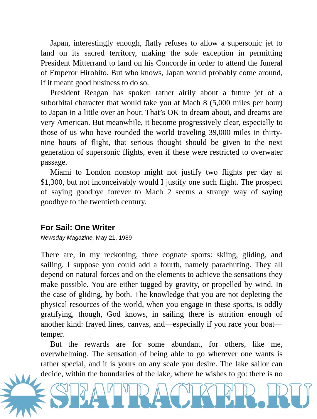 Buckley’s talent for arranging a mise-en-scène stands out in accounts of riding the Orient Express, skiing at Alta, or vacationing at Barbuda. Though himself a central character in the story, he never dominates it. He wrote candidly about travel misadventures, as when his sixty-foot schooner broke down in the Bahamas and was towed to Miami by a Coast Guard cutter, or when a malfunctioning compass landed his boat on a rocky shoal off Rhode Island and the Coast Guard said, “Sorry, we can’t help you.” He also took a gimlet eye to the travel industry and a discriminating palate to airline food, suggesting that airports sell “a really good box lunch” with celery rémoulade, fresh figs, and a nice Bordeaux.