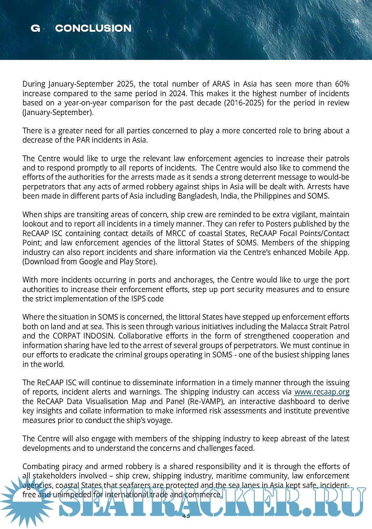 Year: 2025 Language: English Author: ReCAAP Genre: Periodical publication, Research Paper Publisher: ReCAAP Information Sharing Centre Edition: 3rd Quarter 2025 Format: PDF Quality: eBook Pages count: 106 Description: As part of ReCAAP ISC’s efforts to ensure the needs of the shipping industry are met in an ever changing maritime landscape, the Centre launched the enhanced Mobile App for incident reporting and information sharing and produced an updated Guide Book on the identification of fishing boats in Asian waters. For the overall situation of Piracy and Armed Robbery Against Ships (ARAS), commonly known as sea robbery in Asia during January - September 2025, there has been a 68% increase in the number of incidents compared to January-September 2024. A total of 119 incidents of Piracy and ARAS was reported during January-September 2025 compared to 71 incidents during the same period in 2024. Of the 119 incidents, two were piracy incidents and 117 were sea robberies. Among these incidents, 114 were actual incidents and five were attempted incidents. The majority of the sea robberies incidents were petty theft involving perpetrators not carrying any weapons, crew not injured (CAT 4 incidents), and this accounts for 53% (60 incidents) of the total incidents during January - September 2025.