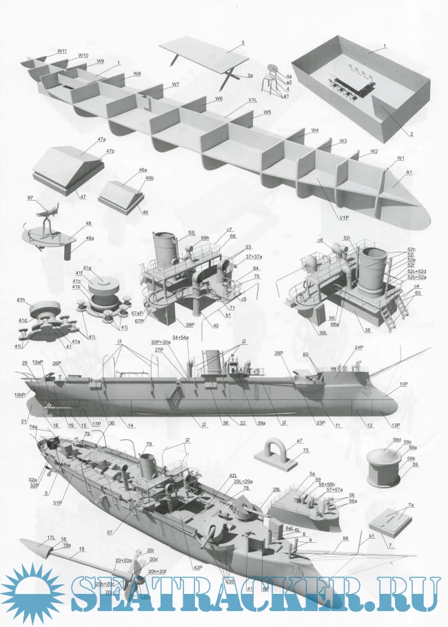 18 листов цветных выкроек и описаний для изготовления бумажной модели канонерской лодки ''Кореец'' в масштабе 1:200Скриншоты