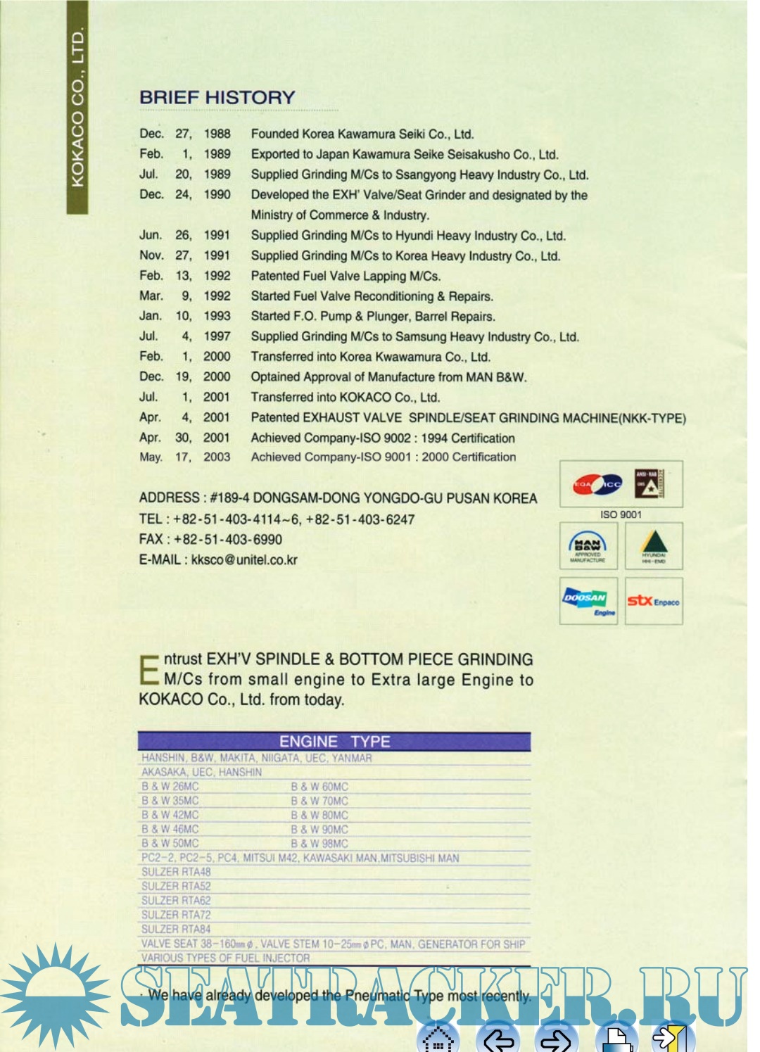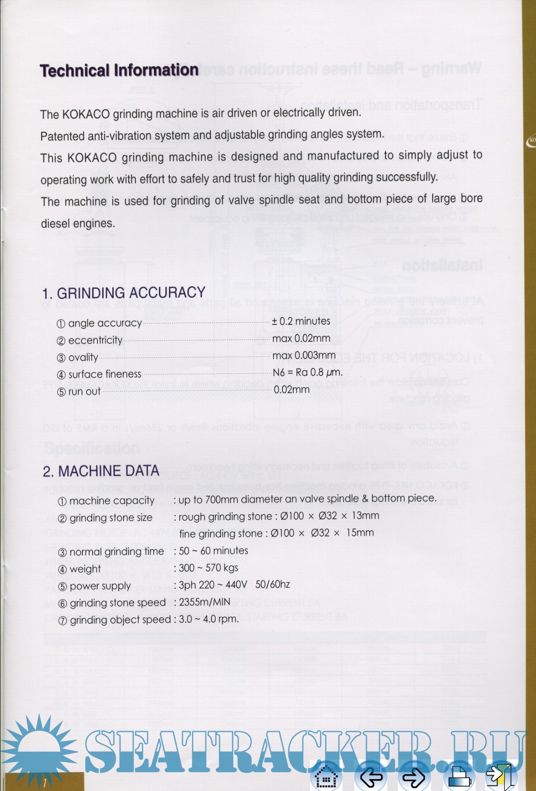 Description: The KOKACO grinding machine is air driven or electrically driven. Patented anti-vibration system and adjustable grinding angles system. This KOKACO grinding machine is designed and manufactured to simply adjust to operating work with effort to safely and trust for high quality grinding successfully. The machine is used for grinding of valve spindle seat and bottom piece of large bore diesel engines.