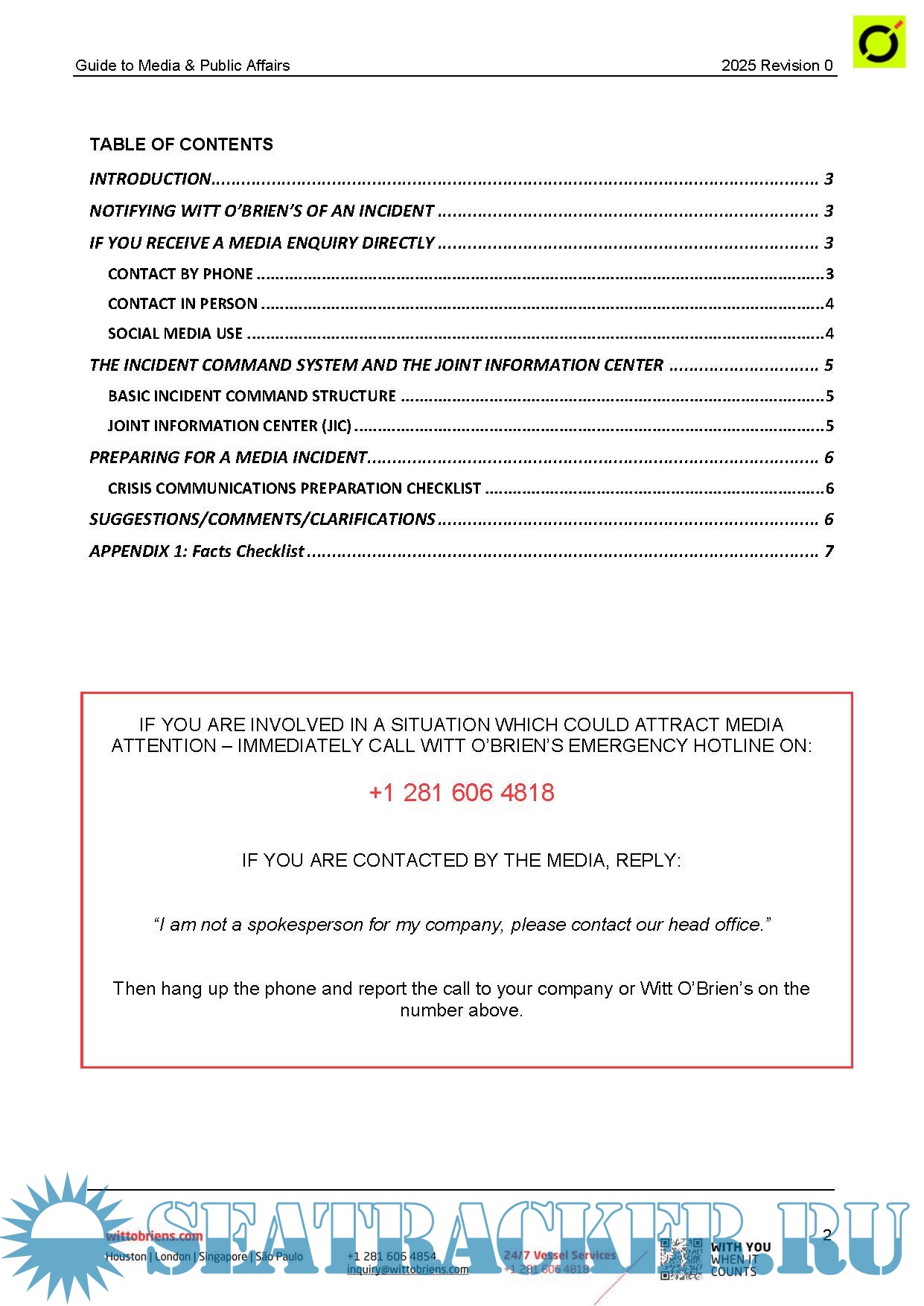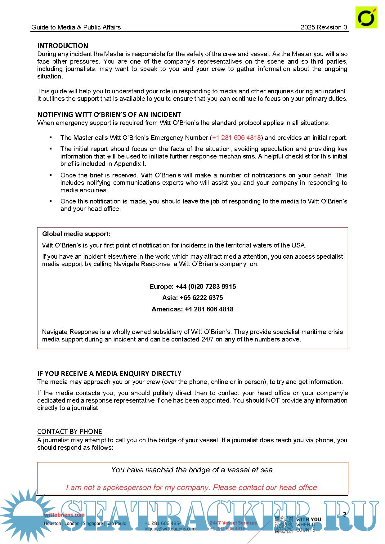 Year: 2025 Language: English Author: Witt O’Brien’s Genre: Guide Publisher: Witt O’Brien’s Edition: Revision 0, 2025 Format: PDF Quality: eBook Pages count: 7 Description: During any incident the Master is responsible for the safety of the crew and vessel. As the Master you will also face other pressures. You are one of the company’s representatives on the scene and so third parties, including journalists, may want to speak to you and your crew to gather information about the ongoing situation. This guide will help you to understand your role in responding to media and other enquiries during an incident. It outlines the support that is available to you to ensure that you can continue to focus on your primary duties. This is a practical guide for Masters and others in your company who may deal with media and public affairs during an incident. It is intended to provide useful direction. It does not replace direction provided by owner/manager/operator. This guide may be modified as required to be in harmony with policies of the owner/manager/operator and is available in a Microsoft Word format. Questions about this guide should be directed to Witt O’Brien’s media response subsidiary, Navigate Response