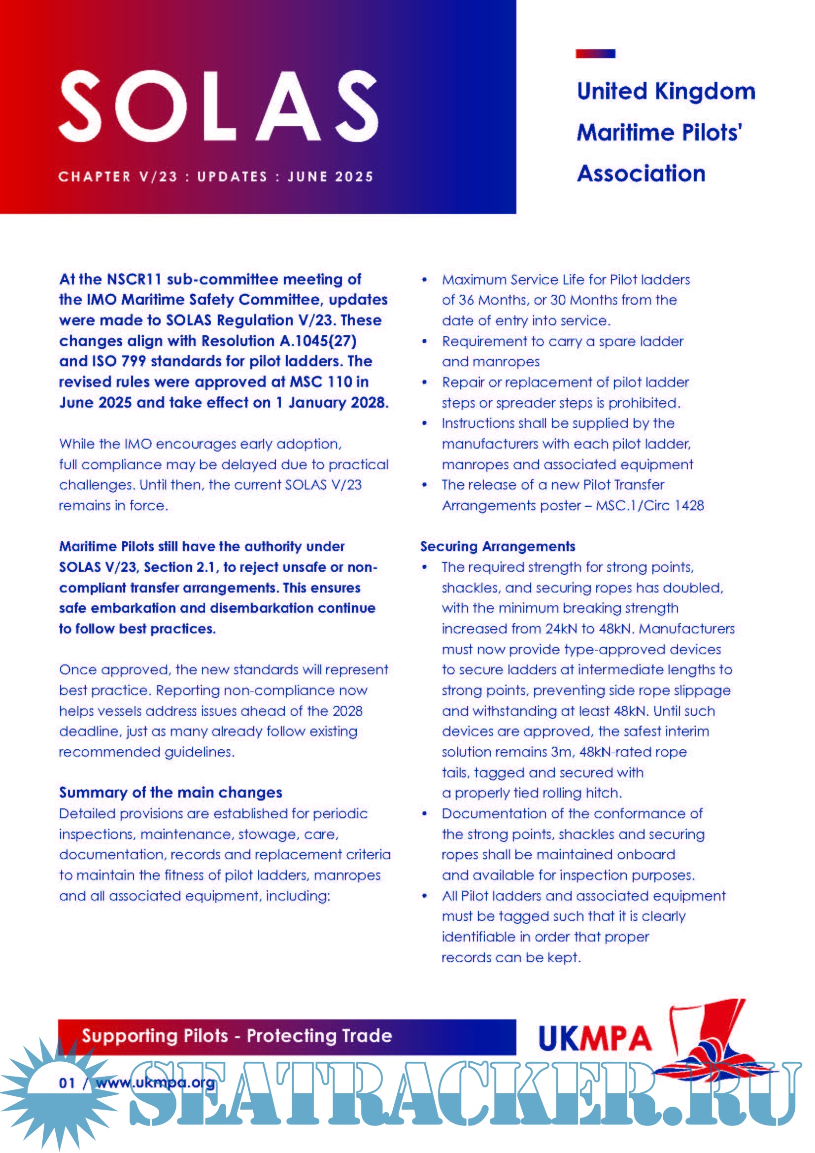 Description: SOLAS Requirements and Implementation of the Amendments to SOLAS Regulation V/23, Enhancing the Safety of Pilot Transfer Arrangements and Required Pilot Transfer Arrangements.