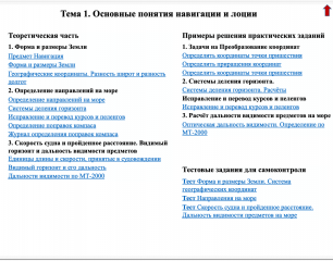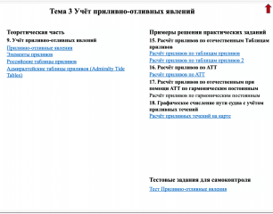 В данном электронном мультимедийном учебном пособии представлены вопросы навигационного обеспечения морского транспорта и рыбного промысла. Рассмотрены базовые основы навигации и лоции, такие как графическое счисление, влияние внешних факторов на движение судна и их учёт, и пр. Подробно разобраны возникновение и учёт приливно-отливных явлений.