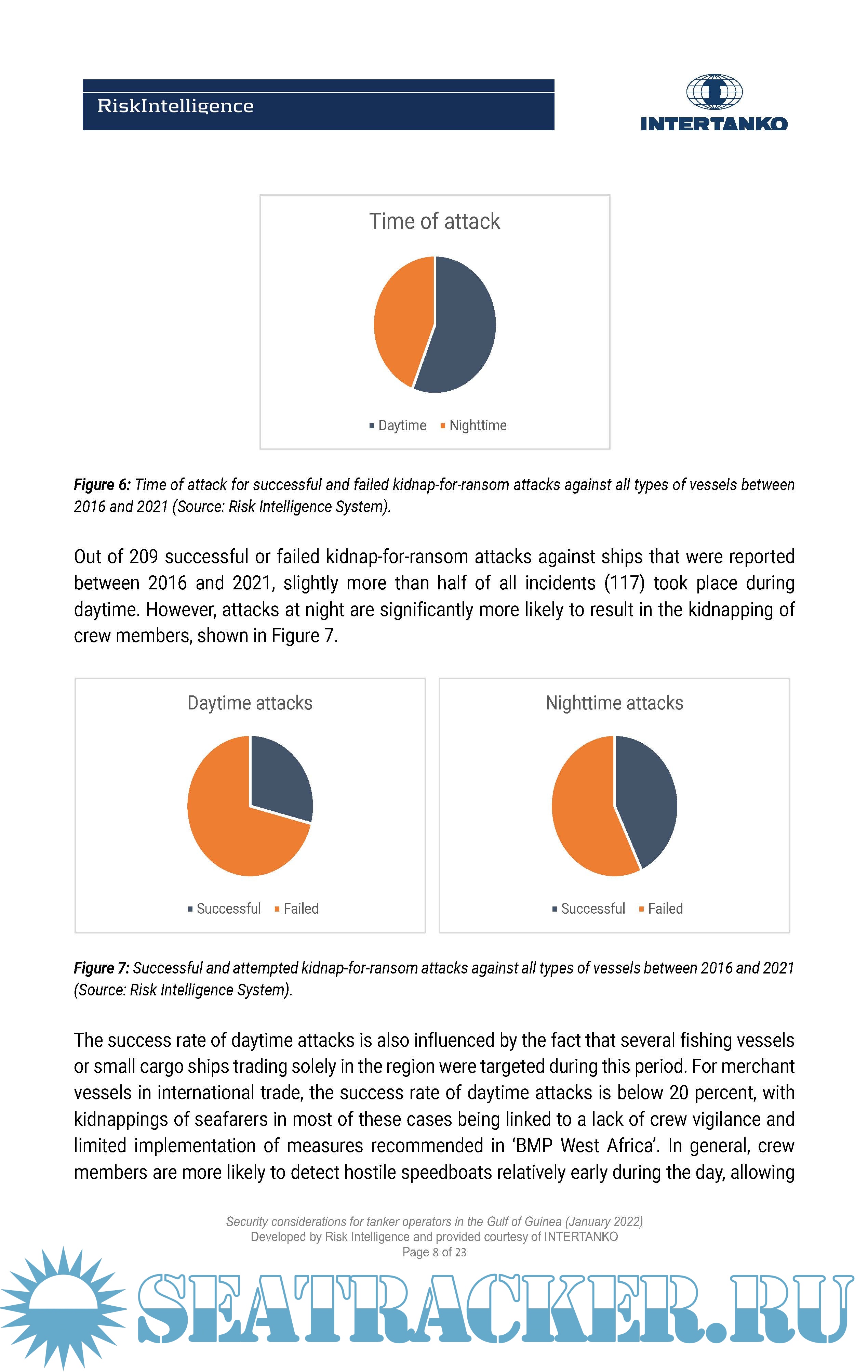Description: Frequent attacks against merchant ships in the Gulf of Guinea, often involving tankers, continue to be a problem for tanker operators. Despite a drop in the number of attacks in 2021 compared with the previous year, the threat level for tanker vessels of all types remains significant. Several successful and attempted kidnap-for-ransom attacks between October and December, including attacks at significant distances from the coastline, have underlined the issue. Overall, the maritime security situation in the Gulf of Guinea remains fragile.