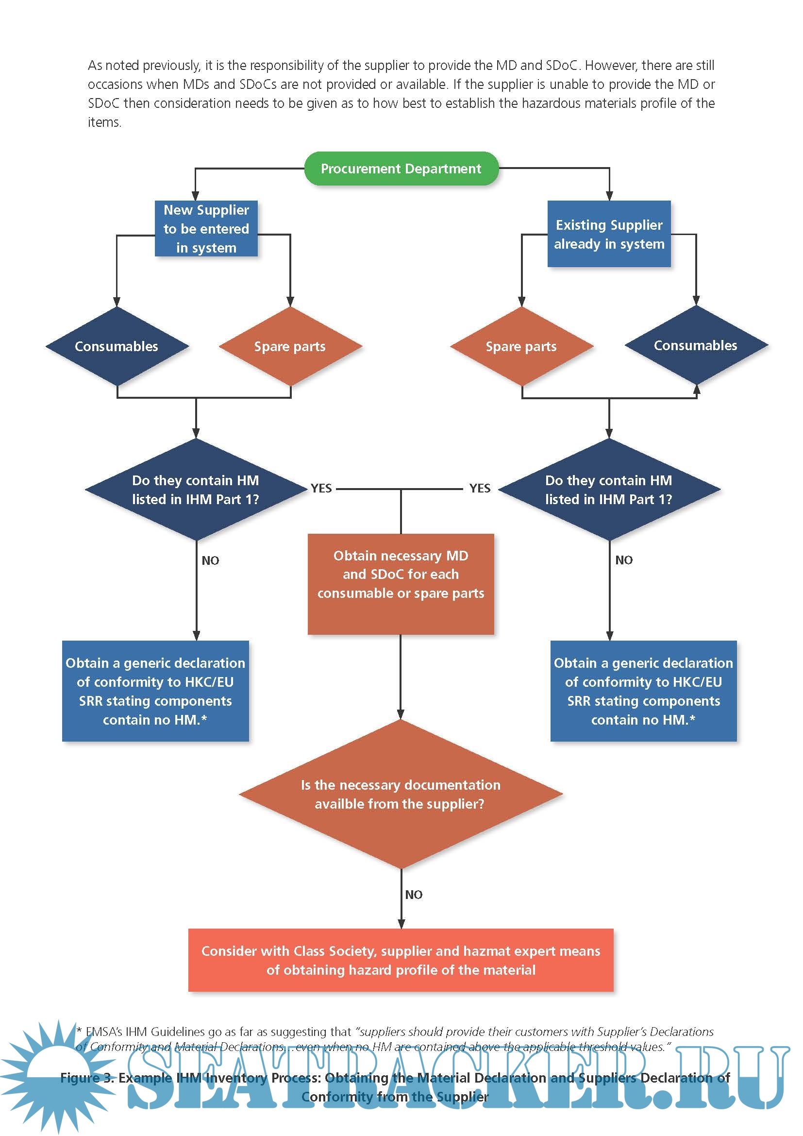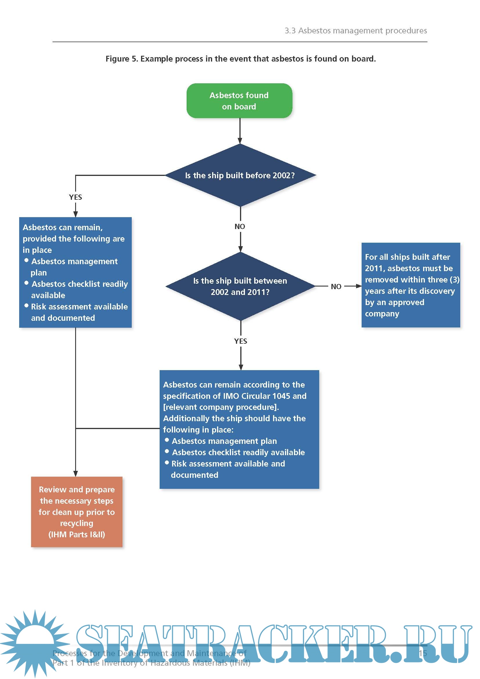 Year: 2020 Language: English Author: Intertanko Genre: Guide Publisher: Intertanko Edition: 1st edition Format: PDF Quality: eBook Pages count: 19 Description: The following document provides examples of process maps for developing and maintaining Part 1 of the Inventory of Hazardous Materials (IHM Part 1) on existing vessels in order to satisfy the requirements of both the EU Ship Recycling Regulation (EU SRR) and the Hong Kong International Convention for the Safe and Environmentally Sound Recycling of Ships (HKC). Together with the example process maps, general guidance on the procedures and a commentary on issues associated with compliance have been provided. This has been drafted based on experience, feedback and exchanges from and within INTERTANKO’s Environment Committee. Noting the 31 December 2020 deadline for enforcement of the EU SRR, INTERTANKO’s Environment Committee agreed it was worthwhile sharing their experiences of developing and maintaining the IHM Part 1. As there are several resources already available for Members to gain an in-depth and detailed understanding of the EU SRR and HKC, the first-hand experiences of Members have instead been shared with a focus on the management processes and procedures that will need to be established in order to develop the IHM Part 1, as well as those procedures that will be necessary to ensure the IHM Part 1 remains updated and compliant. Illustrations have been used as a means of quickly summarizing the example management processes. A simple summary of the two compliance regimes associated with the requirement to develop and maintain IHMs is provided below. More detailed information on the EU SRR and HKC can be obtained from your Administration and/or Class Society. Additional info: While the HKC has not yet entered into force (as of July 2020), the International Maritime Organization (IMO) Guidelines for developing IHMs establishes the international standard and template for an IHM that will be applicable to both the HKC as well as the EU SRR. As such, developing an IHM in compliance with the HKC and its associated Guidelines will assist with compliance with the HKC when it enters into force and will also facilitate certification for compliance with the EU SRR. Note however, the small variance in hazardous materials that are to be included in Part 1 of IHM for compliance with the EU SRR.