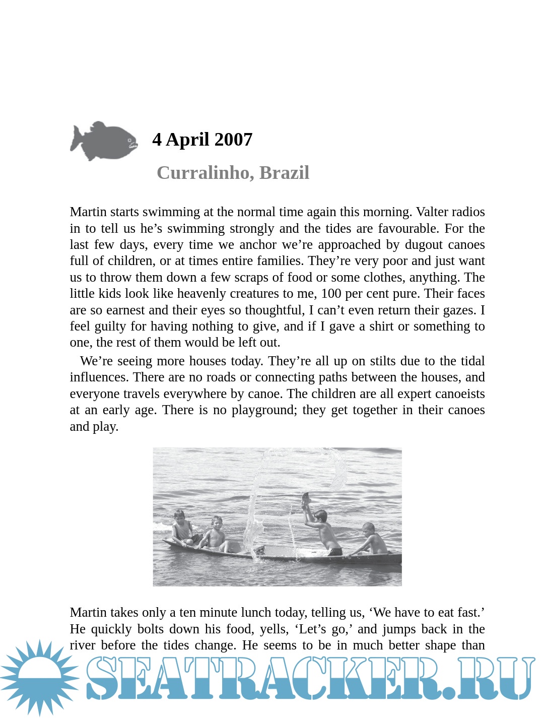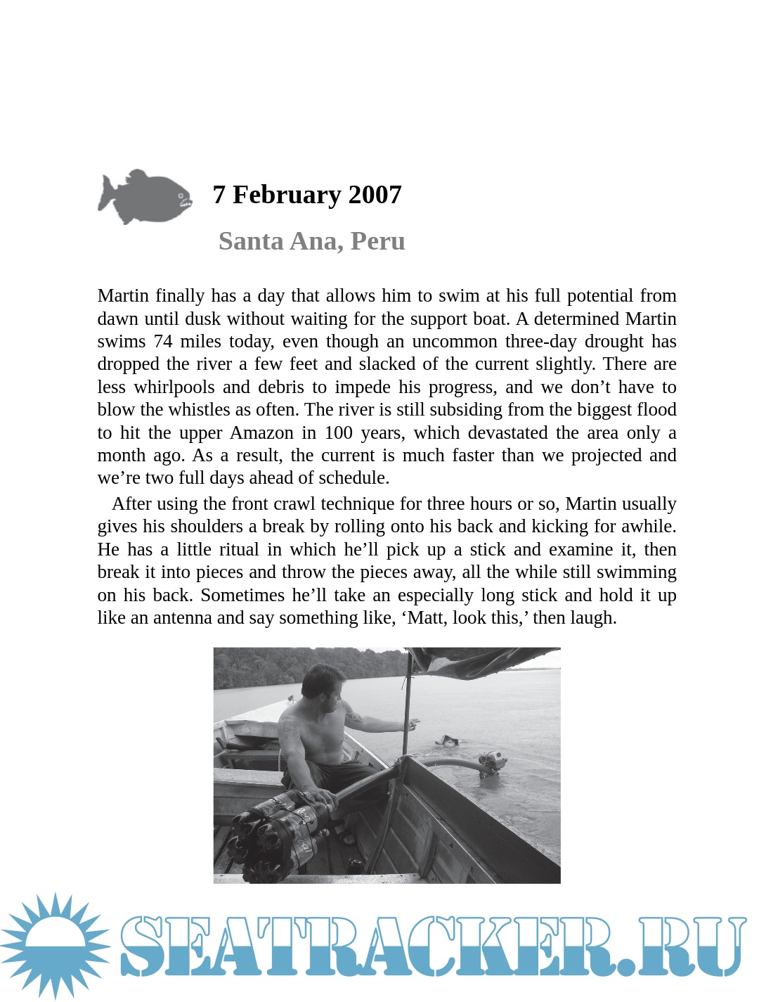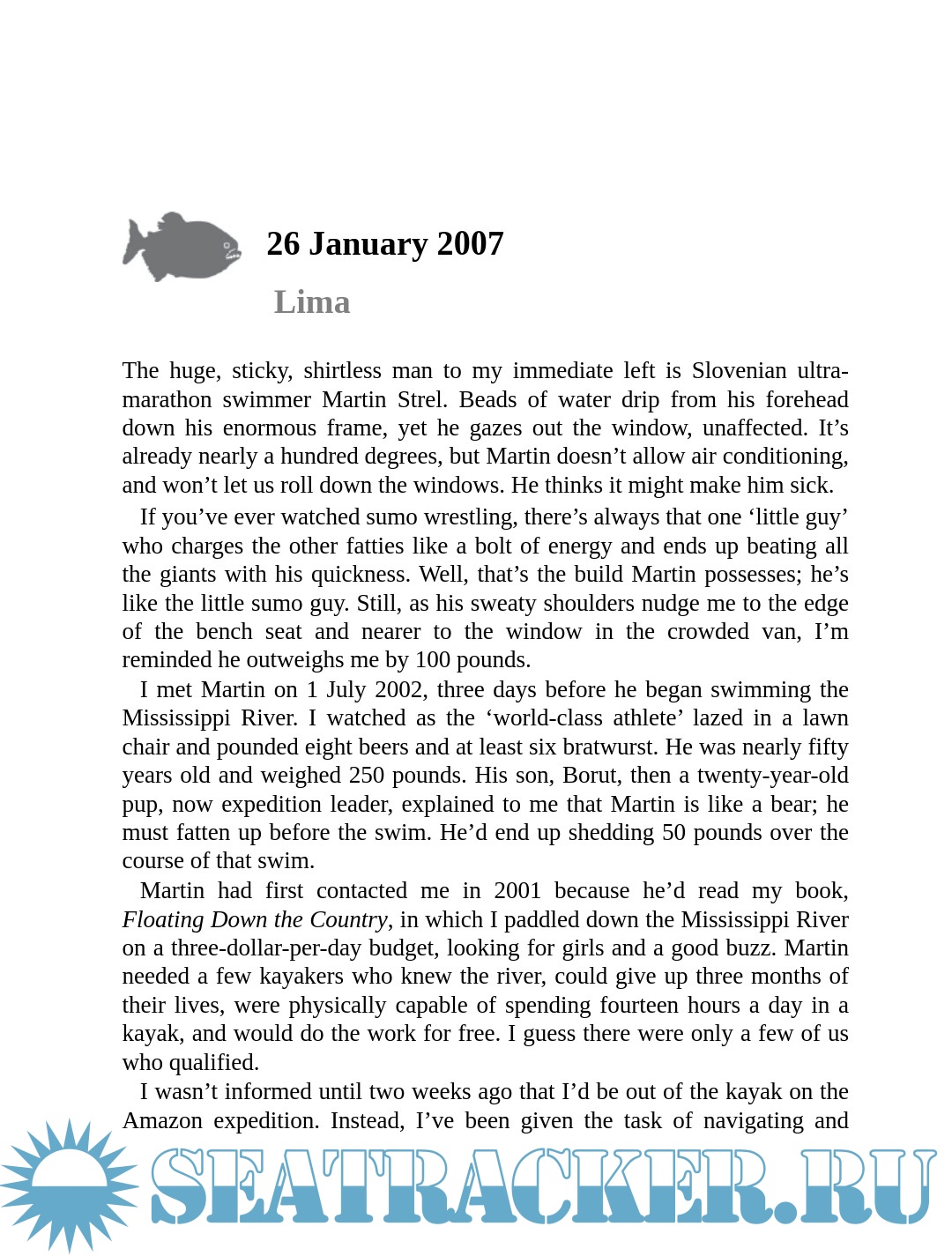 Description: On Sunday, April 8, 200 7, 52-year old Martin Strel completed the first-ever swim of the 3,274-mile-long Amazon River. The Fish Man, as he was called by locals, almost died in the process several times; he encountered deadly piranha, crocodiles, anaconda, river sharks, blistering, relentless sun, dangerous currents, river pirates and drug runners, and the insidious candiru. At the finish his blood pressure was at heart attack level, his entire body full of subcutaneous larvae, and besieged by dehydration, diarrhea, and exhaustion.