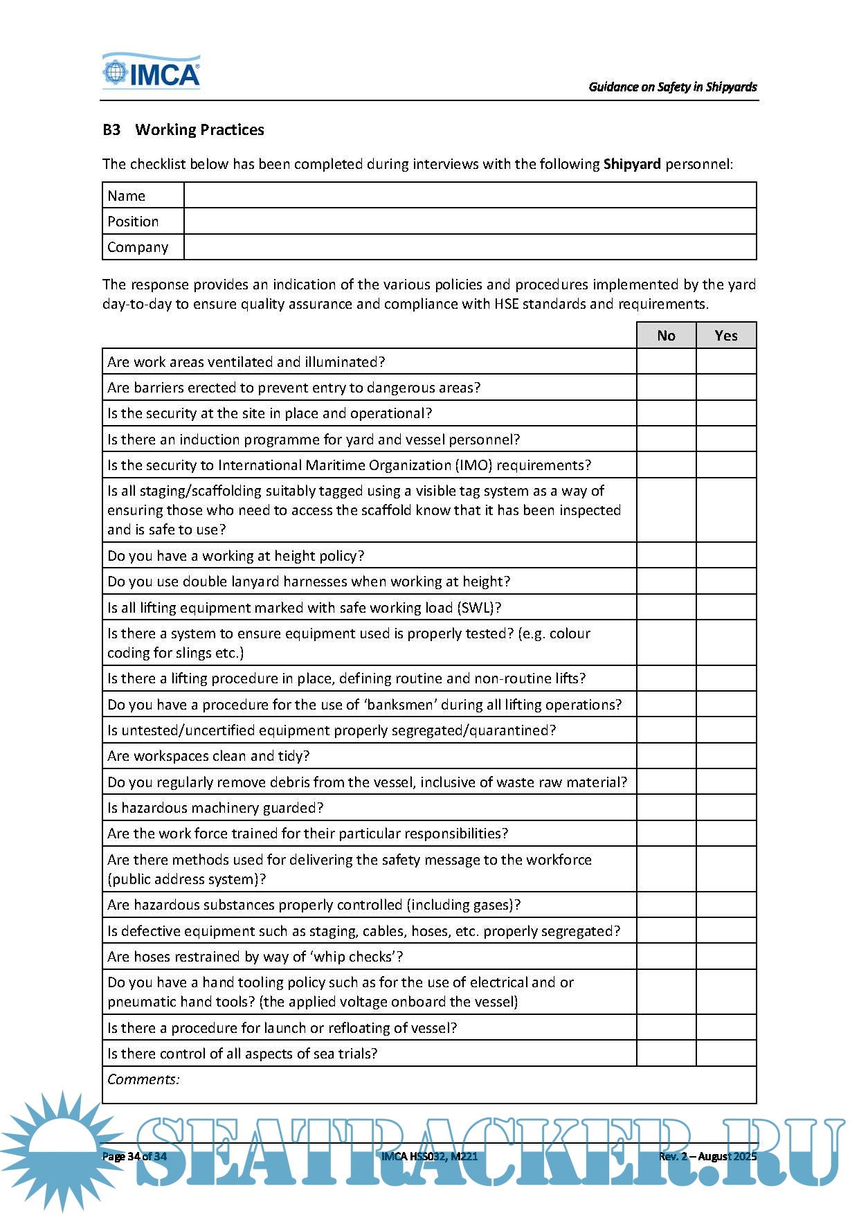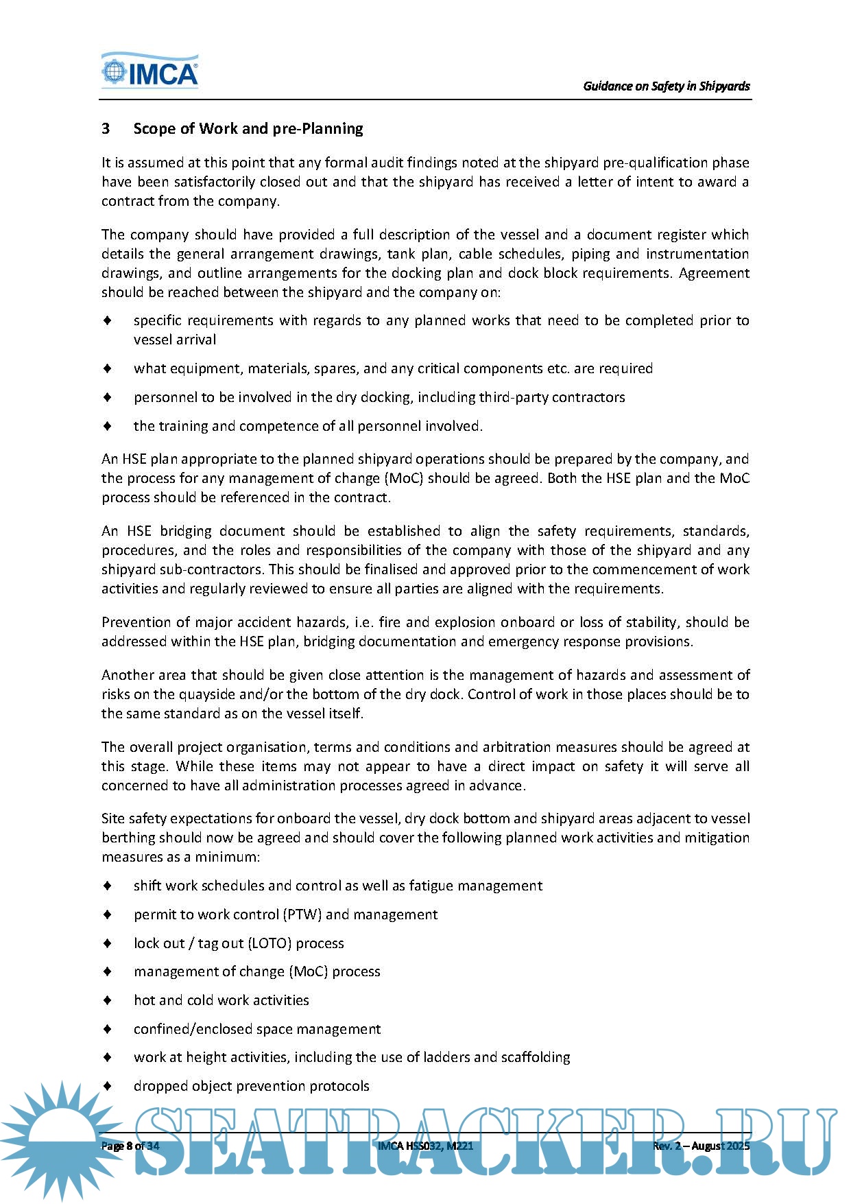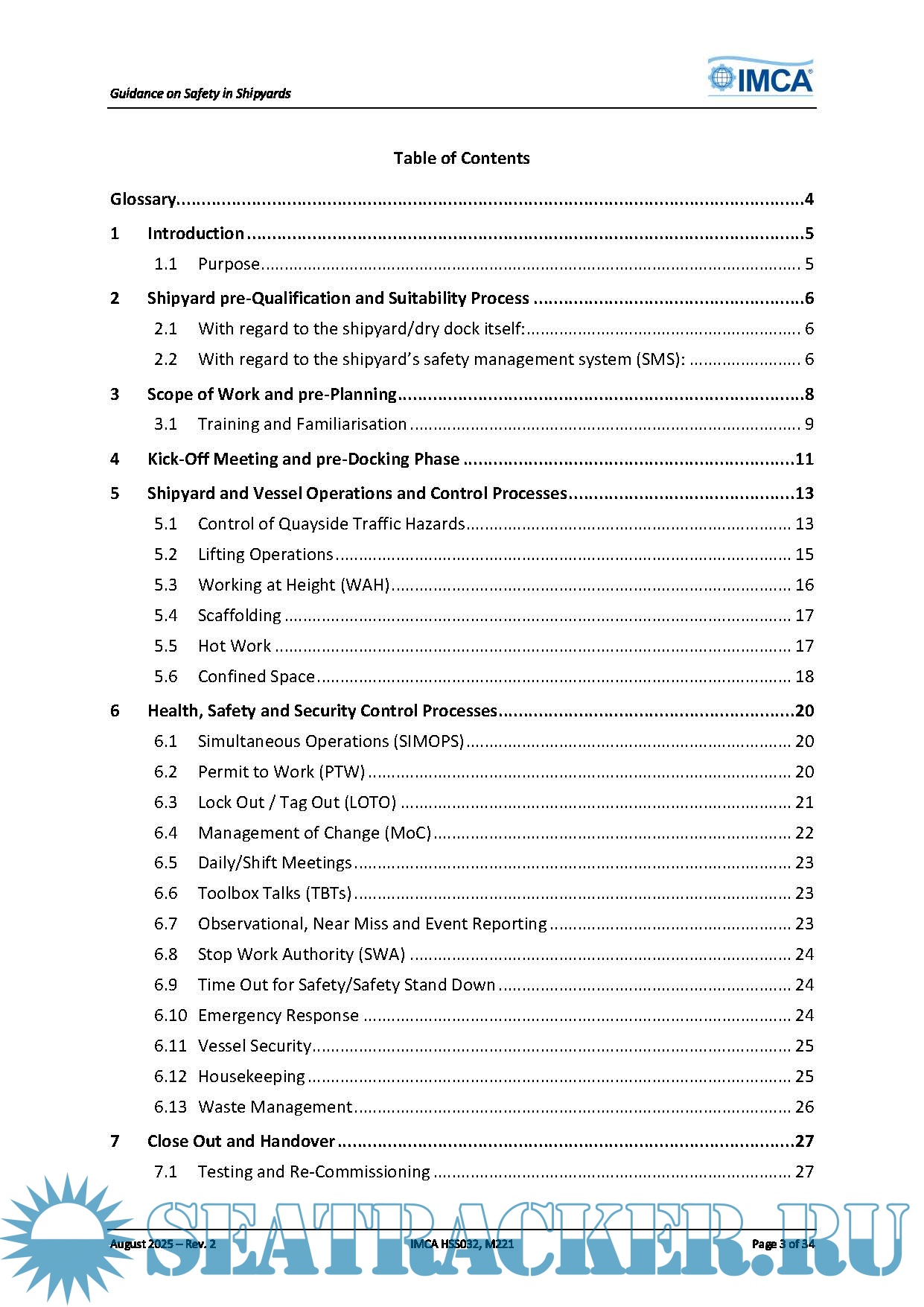 Year: 2025 Language: English Author: IMCA Genre: Guide Publisher: IMCA Edition: Revision 2 - August 2025 Format: PDF Quality: eBook Pages count: 34 Description: The International Marine Contractors Association (IMCA) has published newly revised Technical Guidance on safety in shipyards (IMCA HSS032, M221 – Rev. 2), a comprehensive resource designed to promote best practices and enhance safety standards for vessel owners, operators, and shipyard personnel worldwide. This updated guidance – Recommended Practice on Safety in Shipyards – reflects IMCA’s ongoing commitment to improving performance and safety in locations where marine contractors will work alongside other business sectors and stakeholders, and as such has been made available to IMCA Members and non-members alike. The document provides recommended practices for shipyard safety during dry docking and extended maintenance periods, covering everything from pre-qualification and suitability processes to health, safety, and security controls. The guidance is intended for global use and is not restricted by geographical boundaries or country-specific regulations. It serves as a checklist for both commercial shipyards and in-house repair facilities, supporting safe, lawful, and proper conduct of operations.