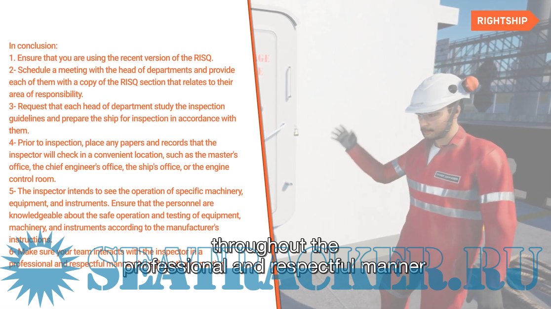 *** RightShip Inspection Awareness Videos 1 - 11 contents: Video 1: Introduction Video 2: Planning for inspection Video 3: Filling out an inspection application form Video 4: What to do once RightShip appoints the inspector Video 5: Are the ship and crew prepared for the RightShip inspection? Video 6: Preparing the ship for inspection - ship management companies Video 7: How to prepare the ship for inspection as the ship’s team Video 8: RightShip inspection - opening meeting Video 9: What happens during a RightShip inspection Video 10: RightShip inspection closing meeting Video 11: RightShip inspection code of conduct ***