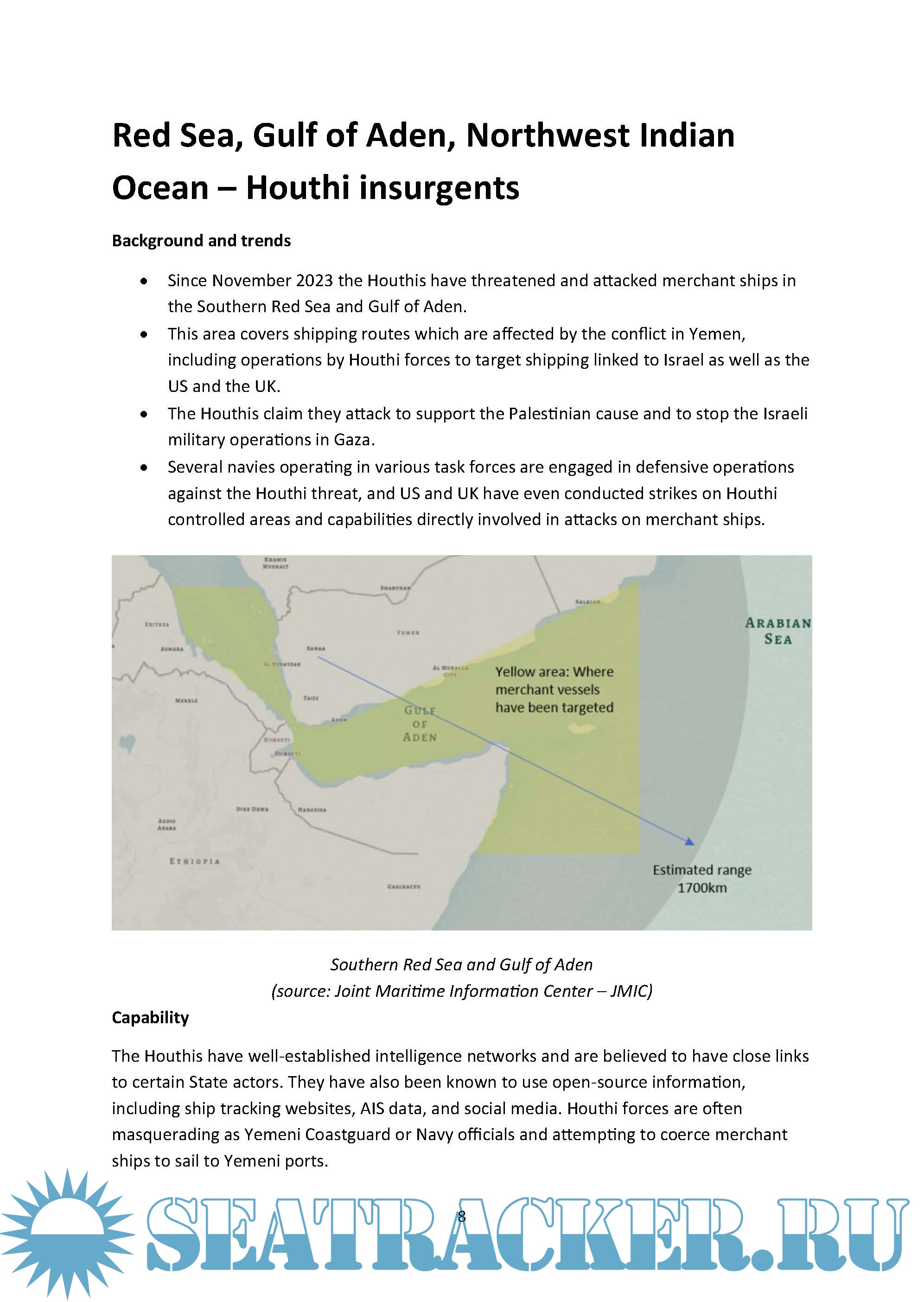 Year: 2025 Language: English Author: BIMCO, ICS and Others Genre: Practical guide Publisher: BIMCO, ICS and Others Edition: 26 November 2025 Format: PDF Quality: eBook Pages count: 18 Description: The purpose of the MISTO is to provide an overall understanding of prevailing security threats. The MISTO has been compiled to provide general and situational information regarding the maritime domain. MISTOs are based on an amalgamation of publicly available information and information obtained by the authors through their networks of stakeholders in shipping, governments, and academia. The information contained herein is based on data available as of the date of this assessment and is subject to change without notice. The MISTO does not constitute a guarantee of the accuracy, completeness, or timeliness of the information provided. MISTOs focus on the physical threats to maritime that have with potential to cause serious harm to people, environment, ship, and/or cargo. This includes acts of piracy, armed robbery, terrorism, and war/armed conflict. In cases where physical security threat actors also pose cyber security threats, these are included in the threat description. Threats such as unwarranted detentions, smuggling, stowaways, blackmail, fraud, corruption, etc. are not covered by the MISTOs.
