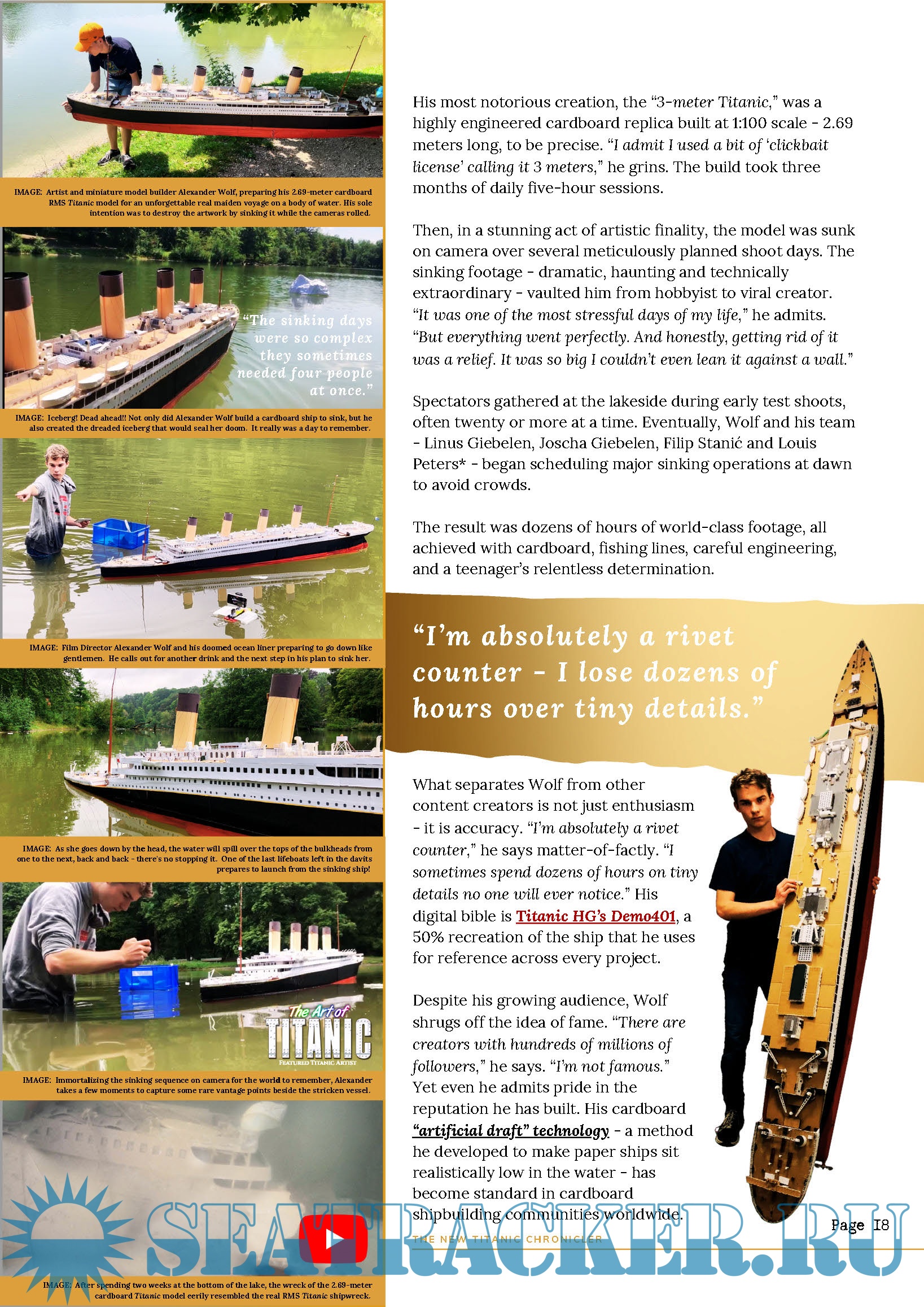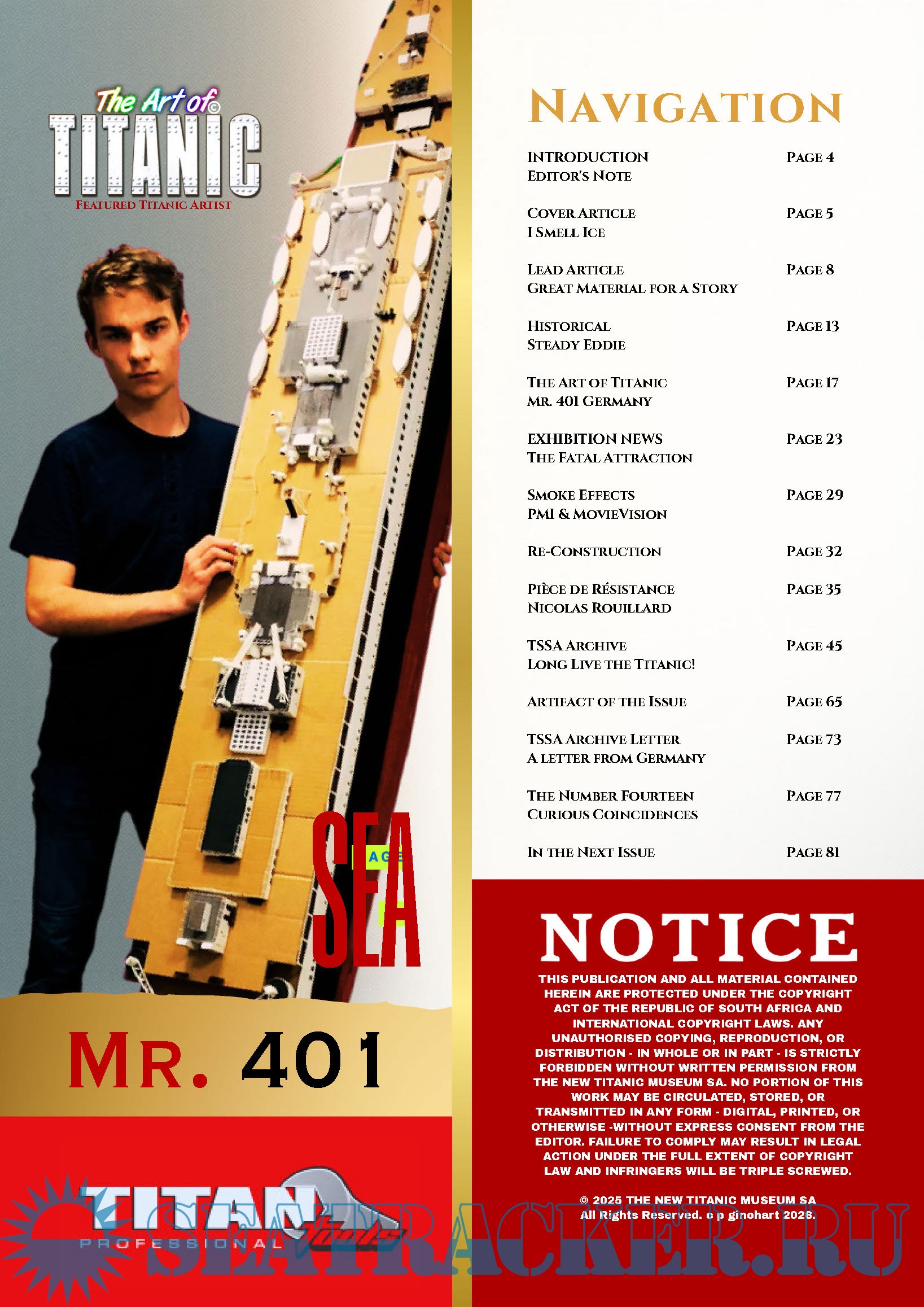 Description: The New Titanic Chronicler is a bi-monthly publication with a primary focus on the creation of "TINTANIC" - the largest Titanic model in Africa - made of "tin". This 8.7-meter (28.5 ft.) replica takes center stage as a testament to the endurance and vision of artist Gino Hart. Each issue also features The Art of Titanic by other Titanic Chroniclers (artists) from around the world, showcasing miniature model art alongside the untold stories of South African connections to the famous wreck. Archival material from the long-forgotten Titanic Society of South Africa are highlighted, preserving a memory that has remained largely unseen 12 500 ft deep in darkness. The magazine is a celebration of history, artistry, and South Africa’s unique connections.