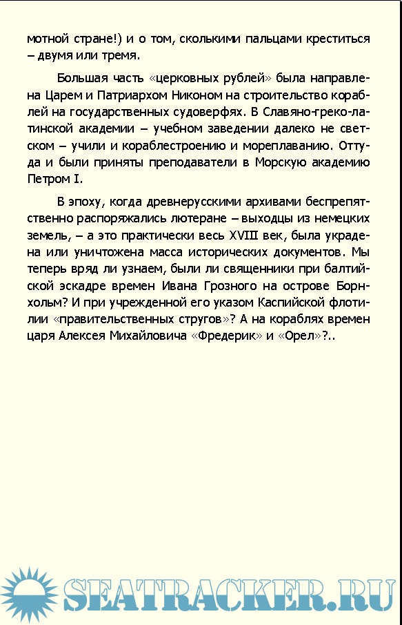 Содержание Предисловие Авторское вступление Духовные наставники морских служителей допетровской Руси Корабельная церковь при царе-антихристе «Революционные реформы» Петра I Забытые подвижники веры Жизнь и приключения монаха-гидрографа Последнее религиозное сожжение Корабельные священники «Золотого века» вольных каменщиков «Золотой век» масонства на флоте Сподвижники «Екатерининских орлов» Ряженый матрос или архиепископ реандамский? Безвестный благочинный эскадры Ушакова Мореплаватели в рясах Молебен у берегов Антарктиды Иеромонах с «Невы» Обвенчанные под андреевским флагом Архимандрит Аввакум - монах-синолог На сенатской замечены не были В последних сражениях парусного флота Отличившиеся при Наварине Священники синопского сражения Духовник Цесаревича и другие «Похвальный религиозный поступок» Корабельные священники броненосного флота У стен Порт-Артура, в купели Цусимы Крест против бунта Священники Великой Отечественной... 1914-1917 гг... Первый и последний В боях и походах Счастливый рок иеромонаха Федора Круглова Подвиг отца Антония Спасенные молитвой «Герои» смутного времени Заключение Приложение 1. О пастырском служении в русском военном флоте Приложение 2. Гибель «Рюрика» Приложение 3. Воспоминания о «Палладе» Использованные источники