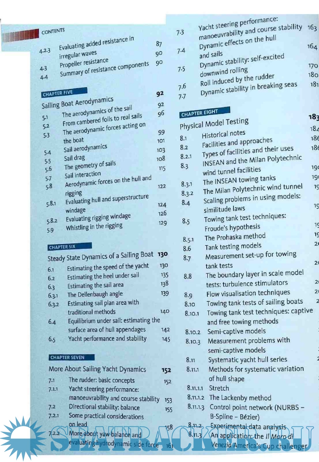 -The Physical model of yacht motion The hydrodynamics of a sailing boat Hull and keel forms More about the hydrodynamics of sailing boat Sailing boat aerodynamics Steady state dynamics of a sailing boat More about sailing yacht dynamics Physical model testing Performance prediction The use of numerical method in yacht design Elements of fluid mechanics Elements of boat hydrostatics The ORC international rating rule