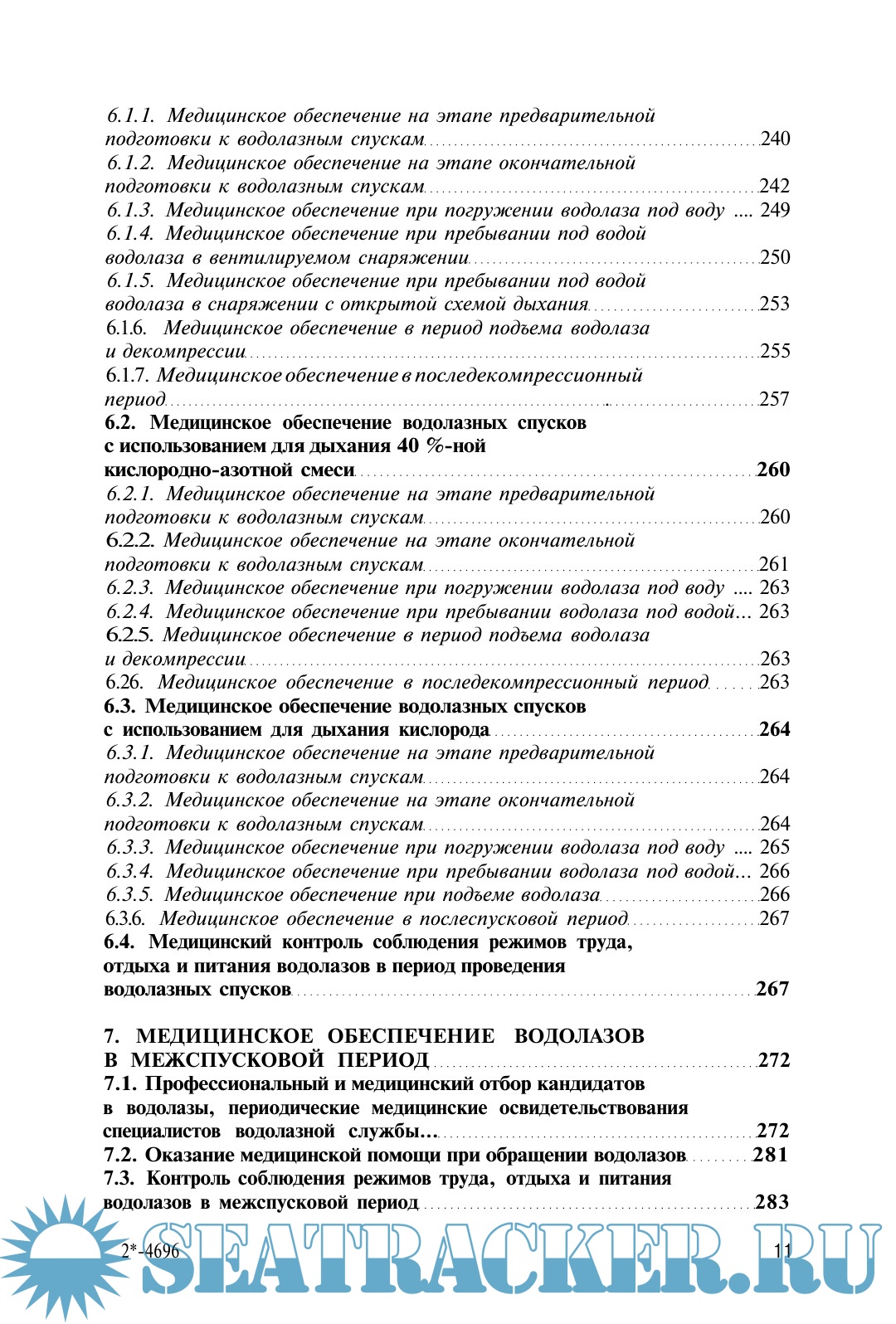 Год выпуска: 2001 Язык: Русский Автор: Смолин В., Соколов Г., Павлов Б. Жанр: Руководство Издательство: Москва: Слово Формат: PDF, ePUB, DOCx Качество: Изначально компьютерное (eBook) Количество страниц: 695 Описание: Книга посвящена спускам под воду на глубины до 60 м и в аварийных ситуациях до 80 м в различных видах водолазного снаряжения с исполь-зованием для дыхания сжатого воздуха, кислорода и 40 %-ной кислородно-азотной смеси, тренировочных спусков в барокамере под давле-нием до 100 м вод.ст., медицинскому обеспечению водолазных спусков и водолазов в межспусковой период. В ней приведены сведения по истории развития водолазного снаряжения и водолазной медицины, технические и физиолого-гигиенические характеристики водолазной техники, опасные и вредные факторы водной и гипербарической воздушной сред, излагаются организация и методика водолазных спусков и их медицинского обеспечения, данные по этиологии, патогенезу, клинике, лечению и профилактике специфических и неспецифических заболеваний водолазов. Представлены основы дайвинга (водолазных спусков по международным правилам), положение об условиях оплаты труда водолазов. Книга предназначена для водолазных врачей и фельдшеров, меди-цинского персонала лечебно-профилактических учреждений, прини-мающего участие в отборе, освидетельствовании и лечении заболеваний водолазов, а также для лиц, осуществляющих санитарный надзор за водолазной техникой и водолазными работами. Она может быть по-лезной для клиницистов различного профиля, врачей-профпатологов, специалистов по гипербарической оксигенации, а также для водолазных специалистов, водолазов и любителей подводного спорта. Рецензент: главный водолазный врач ВМФ, полковник медицинской службы С.В.Никонов