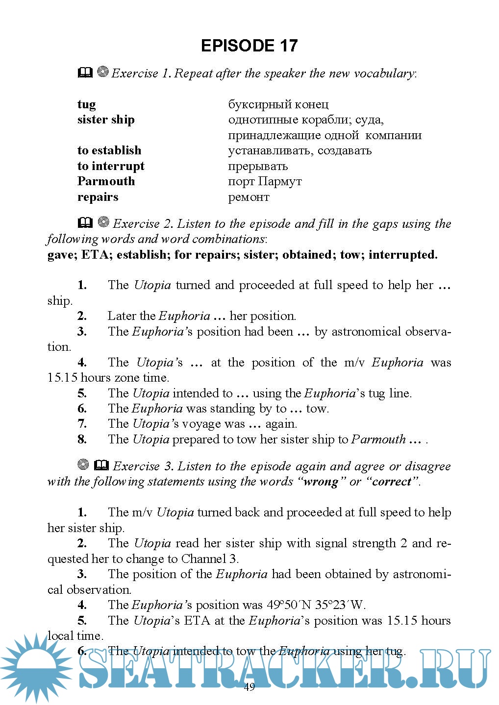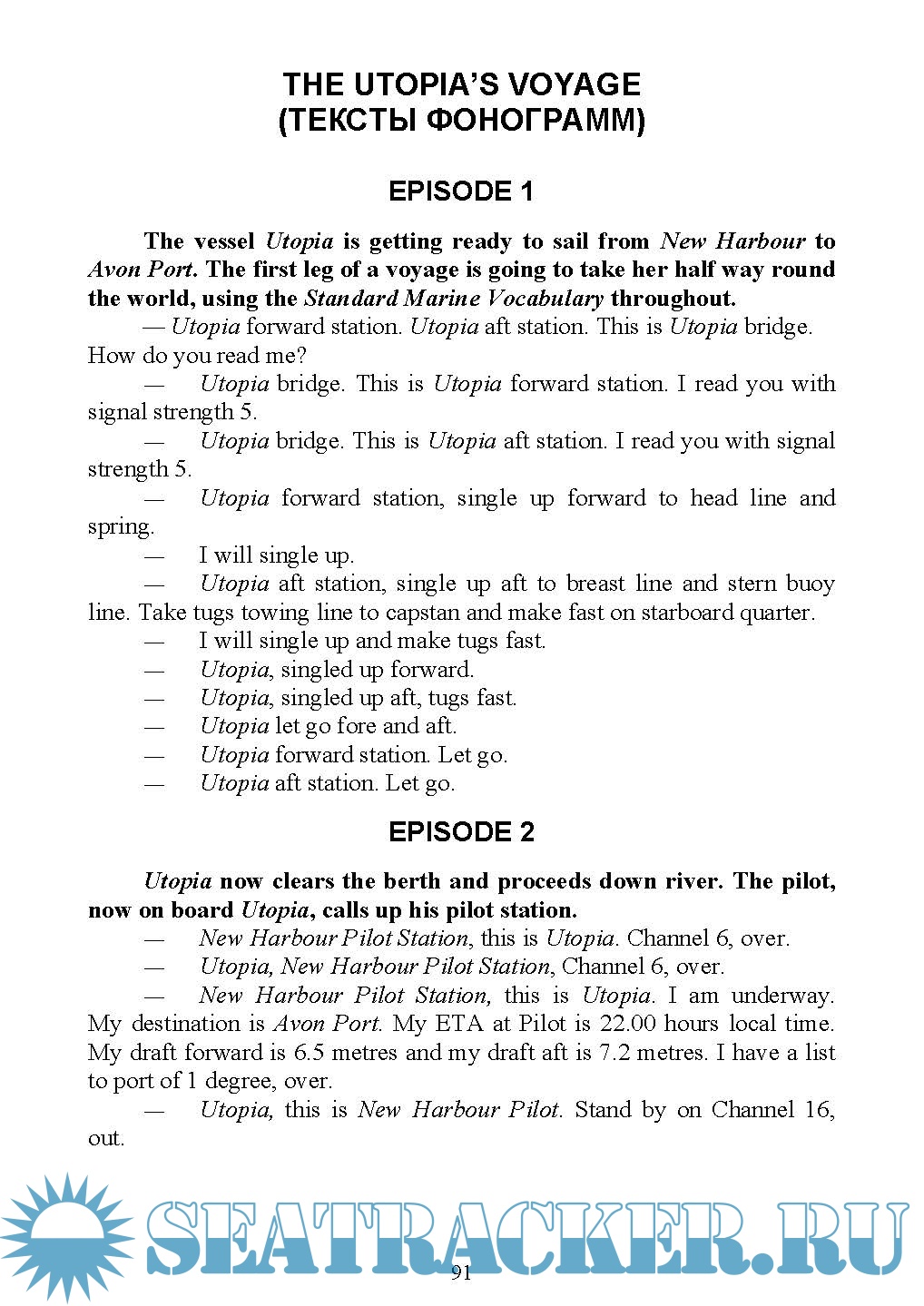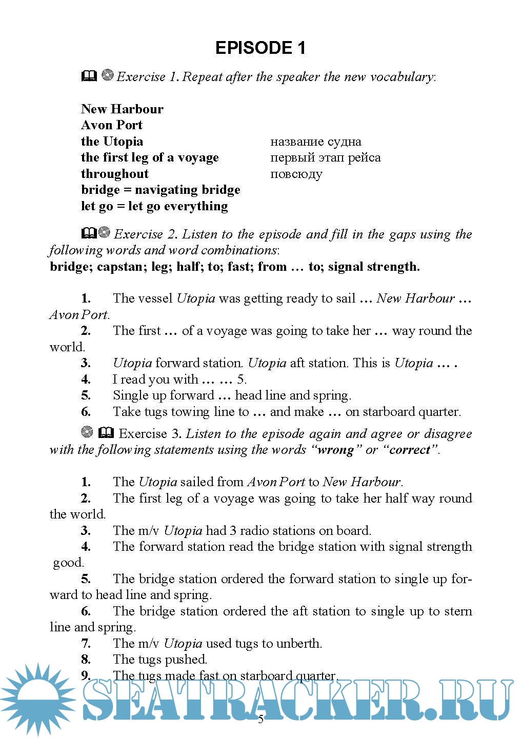 Его цель - развитие восприятия на слух, а также закрепление лексико-грамматических и речевых навыков устной и письменной монологической речи на материале «Стандартного морского навигационного словаря-разговорника».