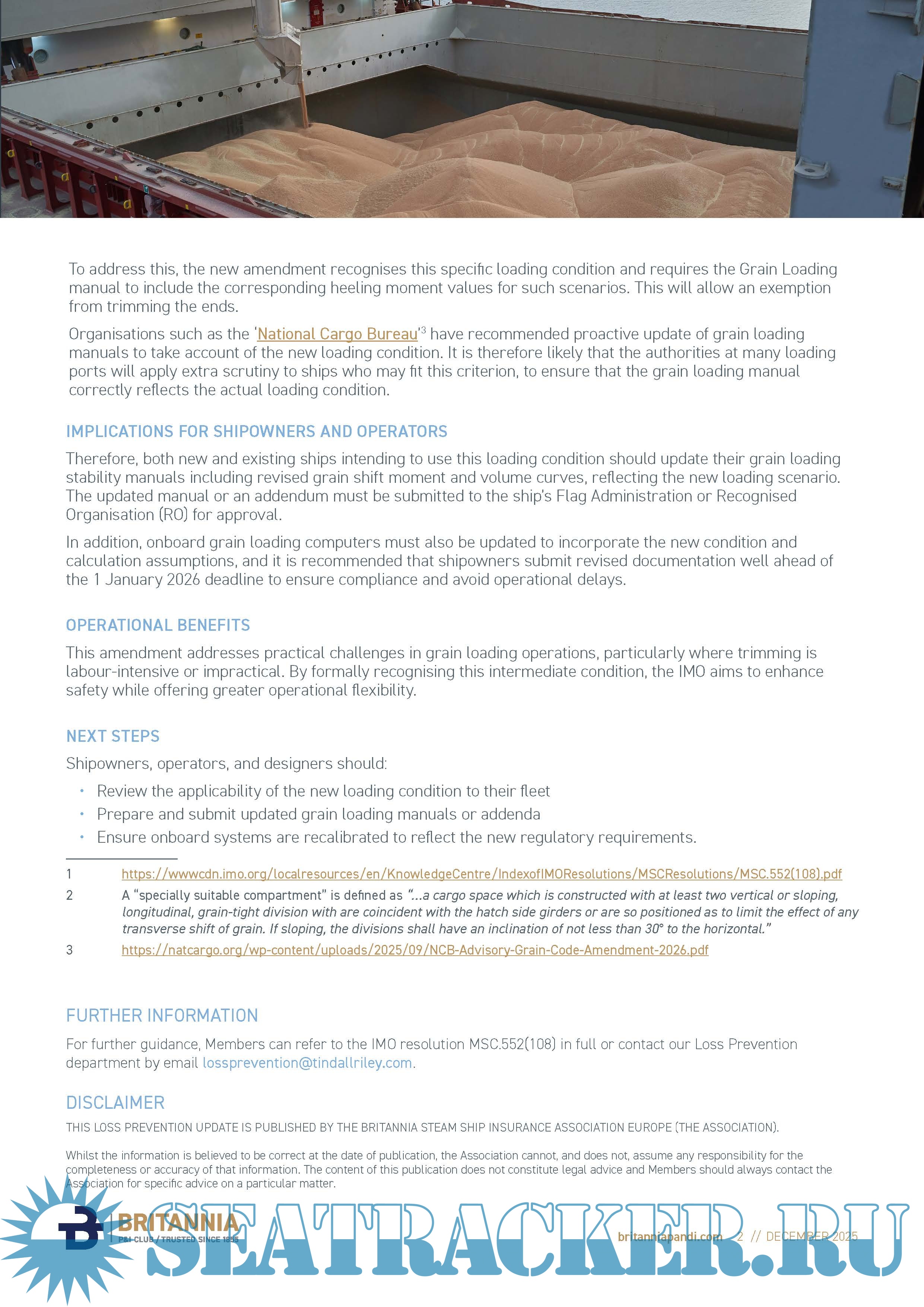 The International Maritime Organization (IMO) has adopted significant amendments to the International Grain Code through Resolution MSC.552(108)1, which will take effect on 1 January 2026 and will be applicable to both new and existing ships. These changes introduce a new optional loading condition aimed at improving flexibility and safety in the carriage of grain in bulk.