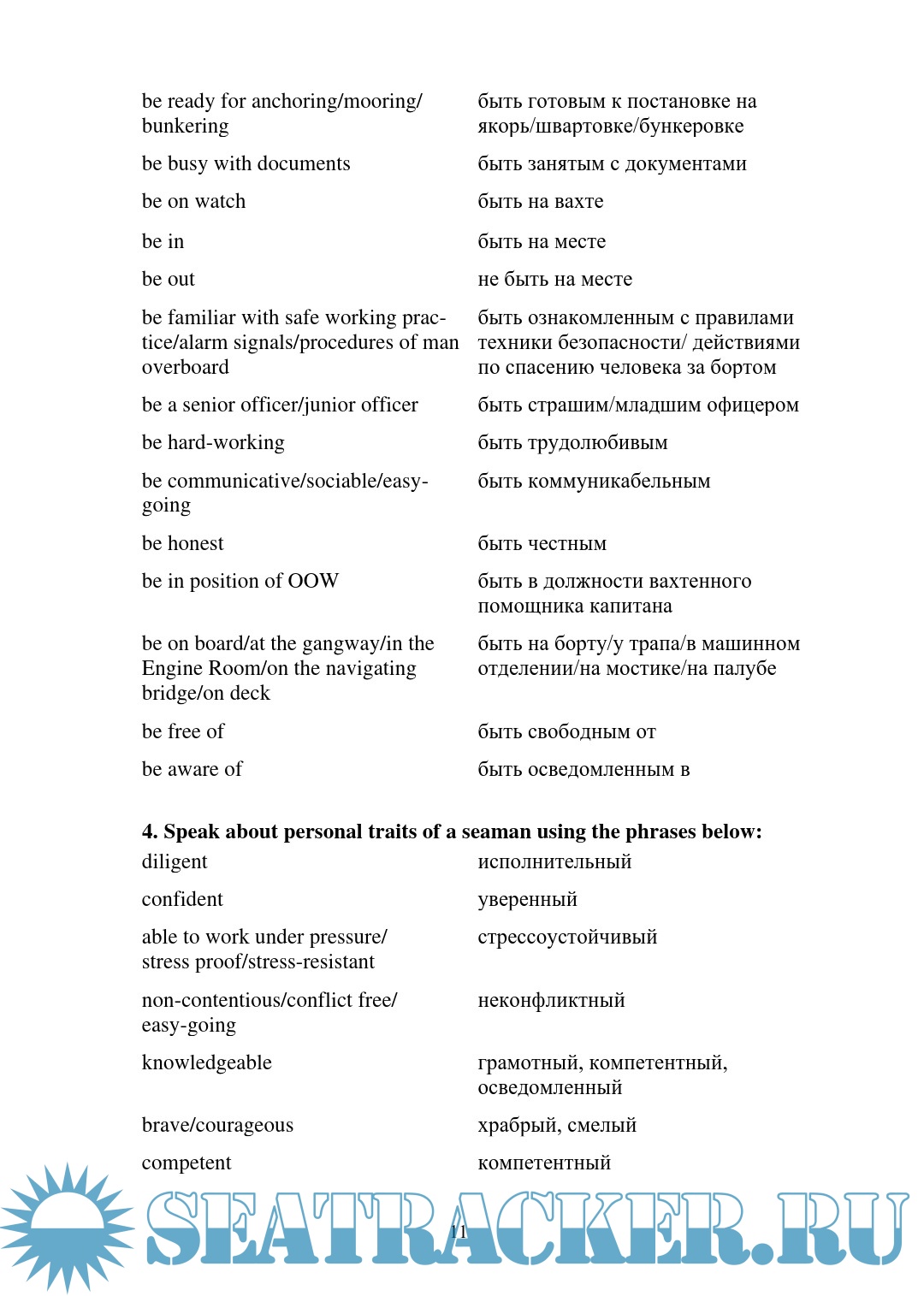 Описание: Учебное пособие составлено по материалам международных морских конвенций и содержит профессиональную лексику, задания коммуникативной направленности, глоссарий для судоводителя и соответствующие изучаемым темам стандартные фразы ИМО для общения на море. Подготовлено в соответствии с требованиями Федерального государственного образовательного стандарта высшего образования. Учебное пособие предназначено для студентов, обучающихся по укрупненной группе специальностей и направлений подготовки высшего образования «Техника и технологии кораблестроения и водного транспорта», изучающих дисциплину «Иностранный язык (английский)».