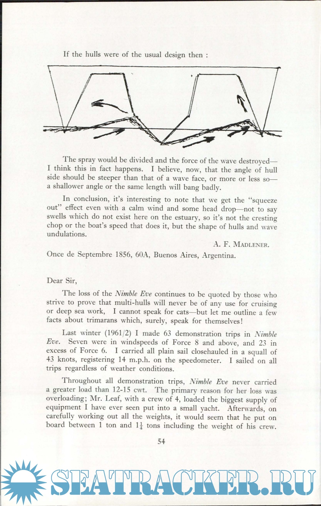 Year: 1963 Language: English Author: A.Y.R.S. Genre: Periodical publication Publisher: A.Y.R.S. Format: PDF Quality: Scanned pages Pages count: 60 Description: The AYRS is a UK registered Educational Charity (No 234081) dedicated to finding out how to make yachting better (faster, more fun, whatever you want it to be). Our members run from sober sided professional yacht designers and builders to bearded eccentrics full of ideas that they cannot make work.From our members have come the modern sailing multihulls, self-steering gear, sailboards, a flock of successful sailing hydrofoils, the World Speed Sailing Record system, etc. Now people are taking off with kiteboats and autogyro-sails, and the first amphibious bicycle.