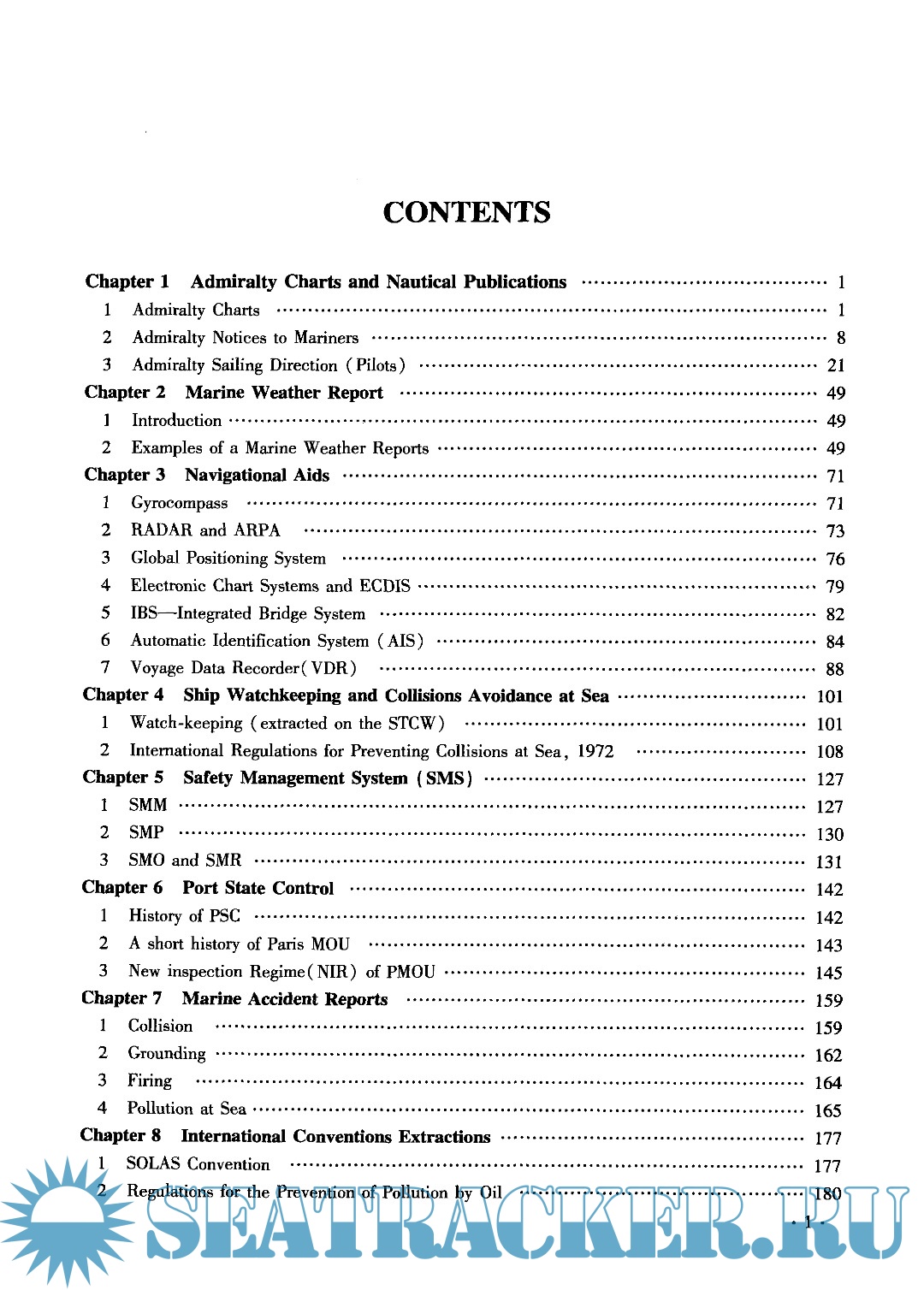 -This book consists of 12 chapters, covering the following topics: nautical publications and chart information, marine meteorological reports, operation of navigational equipment, the International Regulations for Preventing Collisions at Sea (COLREGs) and watchkeeping requirements, safety management systems and SMS documentation, port state control and the ISM Code, accident report reading, excerpts from relevant international conventions, cargo operations, ship structure and ship repair, bills of lading and charter parties, and document writing. This book is intended as a textbook for navigation technology majors at maritime institutions and as training material for seafarer competency examinations. It can also serve as a reference book for maritime professionals, including those engaged in navigation technology and maritime administration.