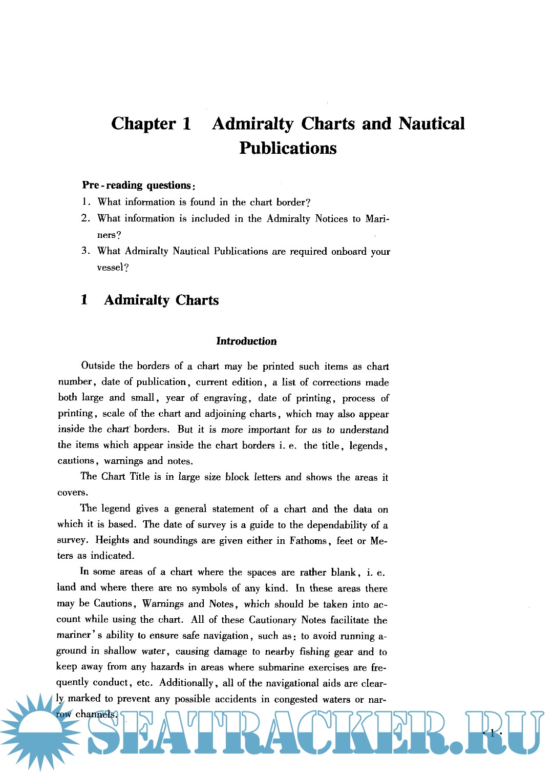 Year: 2011 Language: English, Chinese Author: Edited by Jin Yongxing and Xie Jieying Publisher: Shanghai Maritime University ISBN: 978-7-114-08863-6 Format: PDF Quality: Scanned pages Pages count: 335 Description: This book is one of the outcomes of the Third Batch of Key Course Development Projects at Shanghai Maritime University for the Maritime English Course Group. During its compilation, particular emphasis was placed on reflecting new technologies, regulations, and equipment in maritime navigation developed over the past decade. These include the Electronic Chart Display and Information System (ECDIS), Automatic Identification System (AIS), the International Safety Management (ISM) Code, the International Ship and Port Facility Security (ISPS) Code, and relevant IMO Model Courses. The book is designed to meet the requirements of the STCW Convention concerning the English language competence of seagoing officers. Its content fully complies with the current Examination Syllabus for Maritime English issued by the Maritime Safety Administration of China. The structure of the book is innovative and learner-oriented. Each unit begins with key guiding questions to help students grasp the main ideas, followed by exercises focusing on key words and sentences. Ample margins are provided in both the main text and reading sections to facilitate note-taking. In addition, a set of classic practice exercises is included to strengthen learning outcomes. Chapters 1, 2, and 8 were written by Xie Jieying; Chapter 3 by Pan Jie; Chapters 4 and 12 by Hu Shenping; Chapter 5 by Wang Zhiming; Chapter 6 by Ruan Wei; Chapters 7 and 11 by Li Fei; and Chapters 9 and 10 by Jin Yongxing. Zhang Jinpeng, Yang Zhilong, and Chen Yuli participated in the revision. The book is edited by Jin Yongxing and Xie Jieying, and reviewed by Professor Shi Chaojian and Alexander F. Hickethier, an American instructor specializing in maritime navigation technology. This book is highly targeted, professional, and practical. It has been revised based on teaching experience from the past two years. It can be used not only as a textbook for maritime navigation students and for training candidates preparing for seafarer competency examinations, but also as a reference for maritime professionals and personnel engaged in maritime administration and related fields. Due to the authors’ limited knowledge and experience, errors and shortcomings may be unavoidable. Readers’ valuable comments and corrections are sincerely welcomed.