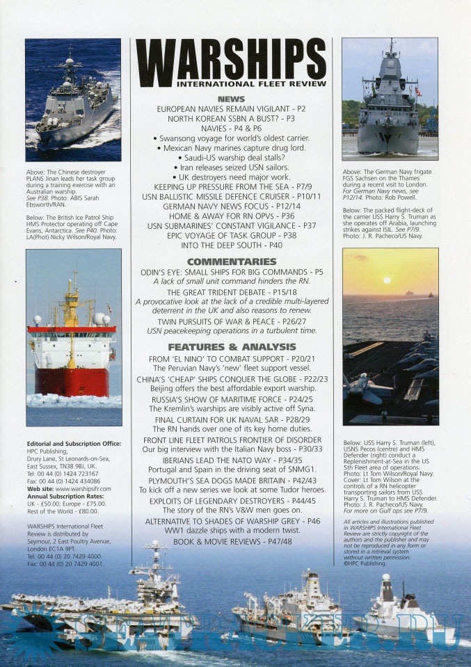 Description: Warships IFR puts the spotlight on the latest developments in the world’s navies. It covers current defence issues and has comments by leading analysts. The magazine regularly includes features on the Royal Navy and the US Navy in addition to incorporating news and features on all other navies across the globe. Warships IFR frequently carries in-depth articles on naval heritage.WARSHIPS International Fleet Review is published 12 times a year by Tandy Media Ltd who also publish Shipping Today & Yesterday (which provides news and features from the world of merchant shipping).