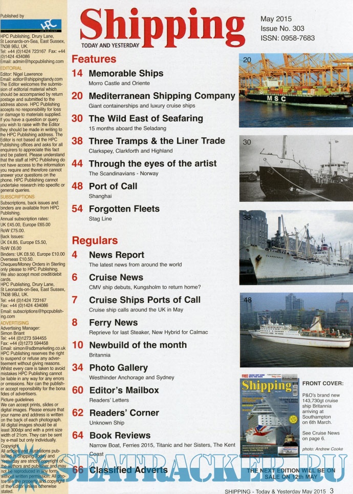Description: Shipping T&Y is a monthly magazine for the shipping enthusiast offering up-to-date information, topical and in-depth historical articles alongside images, many of which are exclusive to the magazine.Shipping Today & Yesterday is a specialist magazine for the shipping enthusiast offering up-to-date information, topical and in-depth historical articles.Shipping Today & Yesterday was first produced in March 1990 by, the then Editor and Publisher, John Young. The first edition stated that it would, “offer a news service covering important developments in the Shipping industry Today and will look back at ships and events of Yesterday, with regular features on merchant ships