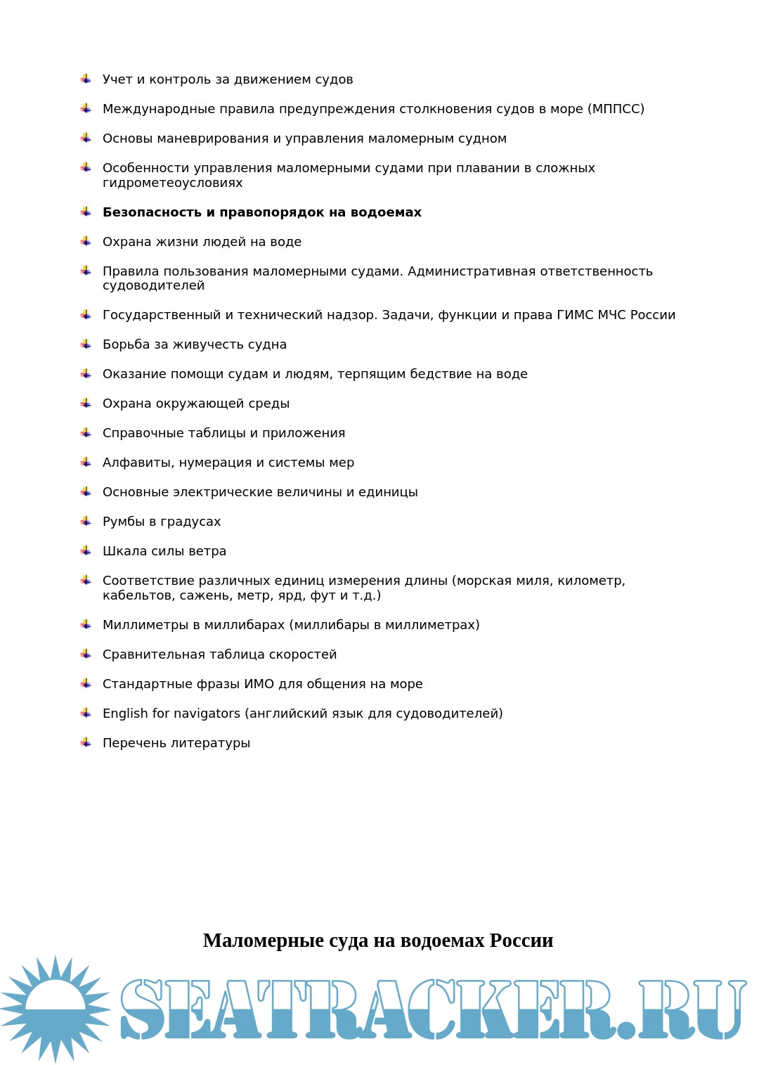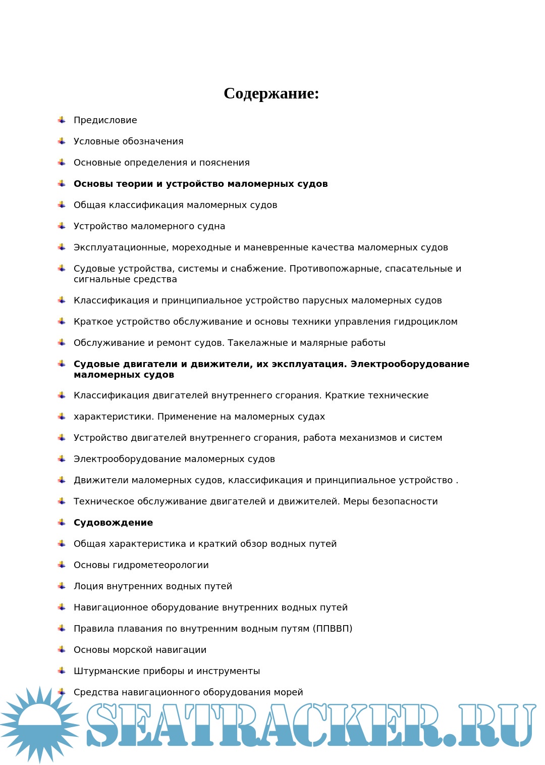Описание: Книга предназначена для подготовки граждан к сдаче экзаменов на право управления маломерными судами в различных районах плавания. В ней подробно освещены вопросы устройства маломерного судна, судовождения, безопасности на водах. Полезная информация содержится в справочных таблицах и приложениях. Изложенные в книге материалы соответствуют требованиям Типовой программы подготовки судоводителей, утвержденной МЧС России