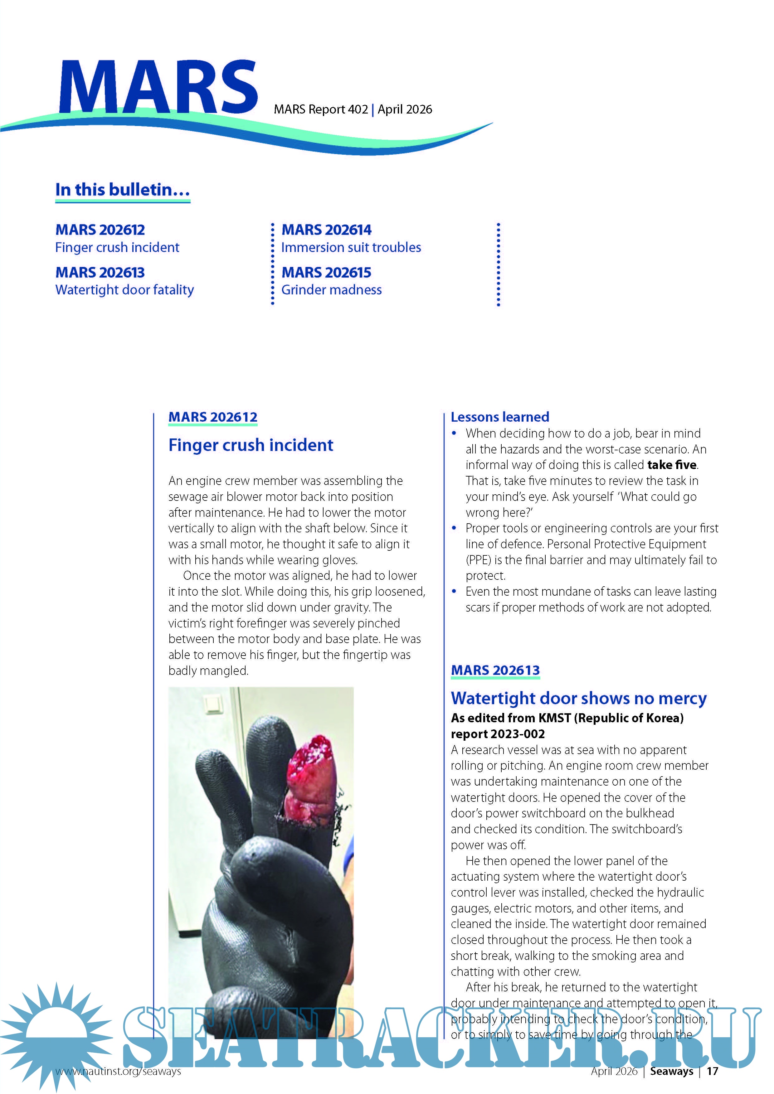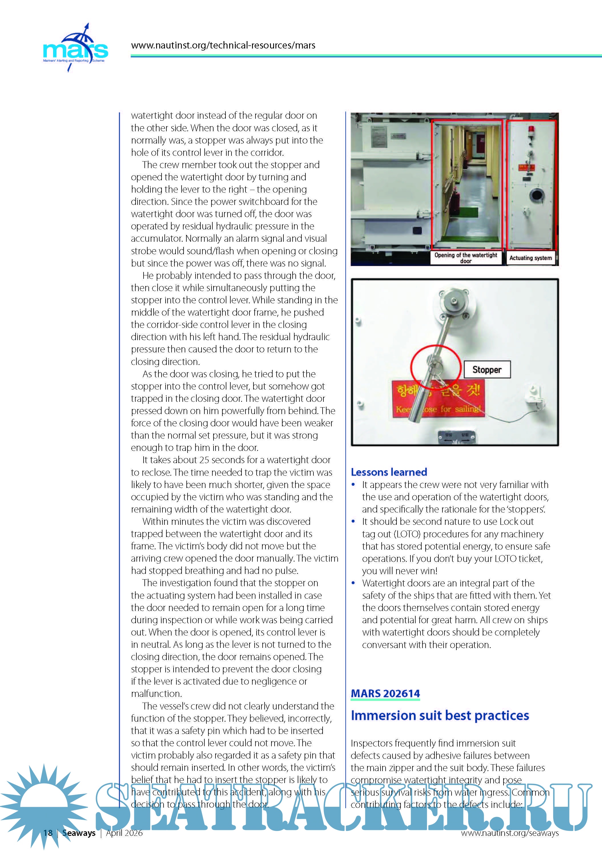 Funded through the generous support of the Institute's Nautical Affiliate partners, it is one of the maritime industry's leading risk reduction initiatives and is helping to make life safer for seafarers everywhere. The MARS reports in this issue are merely a very selective glance at this insidious problem. Systemic negligence on a personal, corporate and international level is in play. By ignoring the findings of the research on this topic, stakeholders have allowed a preventable hazard to become a tolerated operational risk.